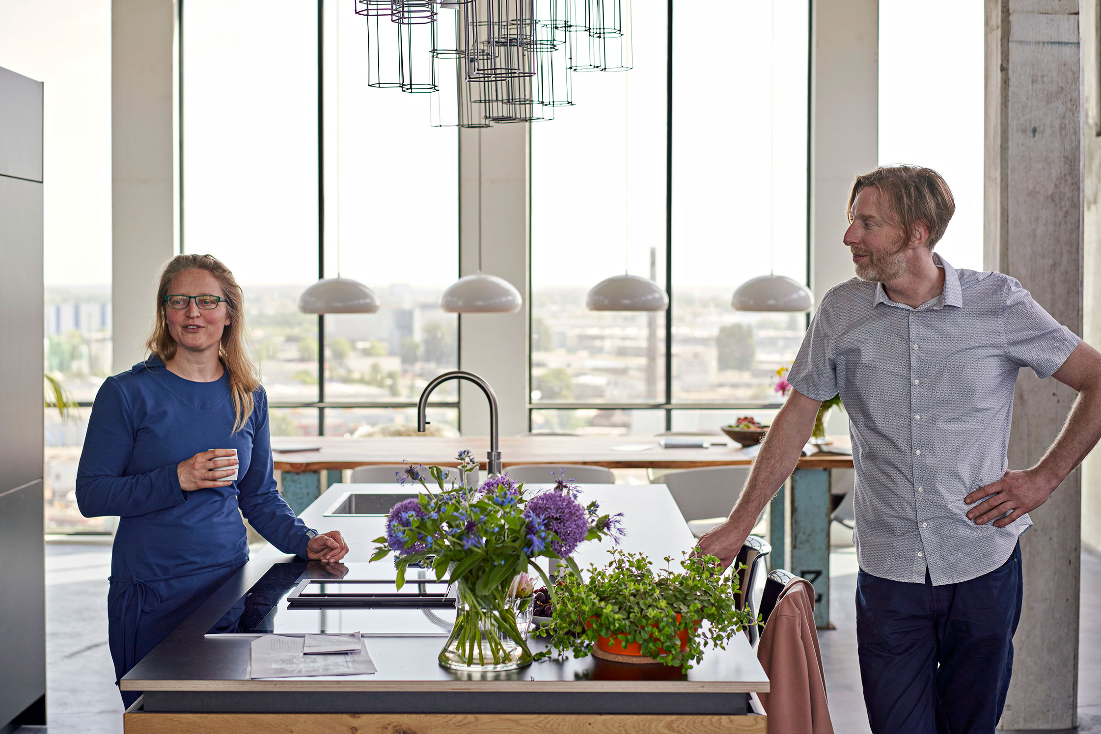Many innovative technological solutions like this one can be found around the home, from self-cleaning windows (a must at this height) to solar connectors for warm water and lights that can be turned off even when you’re already downstairs on solid ground. “It was important to us to make sustainable choices, and make the building future-proof. And in a building like this, it’s important that everything is as simple and practical as possible,” José explains. “I’m grateful for all these technological solutions,” Anjo adds, “like when I don’t have to check if all the windows and doors are closed. And in the mornings, when the coffee machine makes a delicious cup of coffee, looking out of the window to the rising sun. Those are the best moments.”