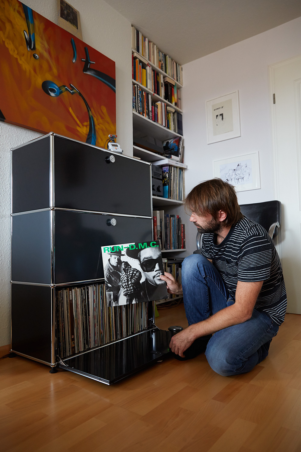 I like colors, even though I do the occasional monochrome picture. It has to look good, that’s all. Of course my apartment could be funkier, the shelf could have different colors but that wouldn’t really suit me. I mean, I’m not running around in bright yellow pants and a blue shirt, I prefer to be more subtle. It’s my painting that I want to stand out and catch people’s attention.