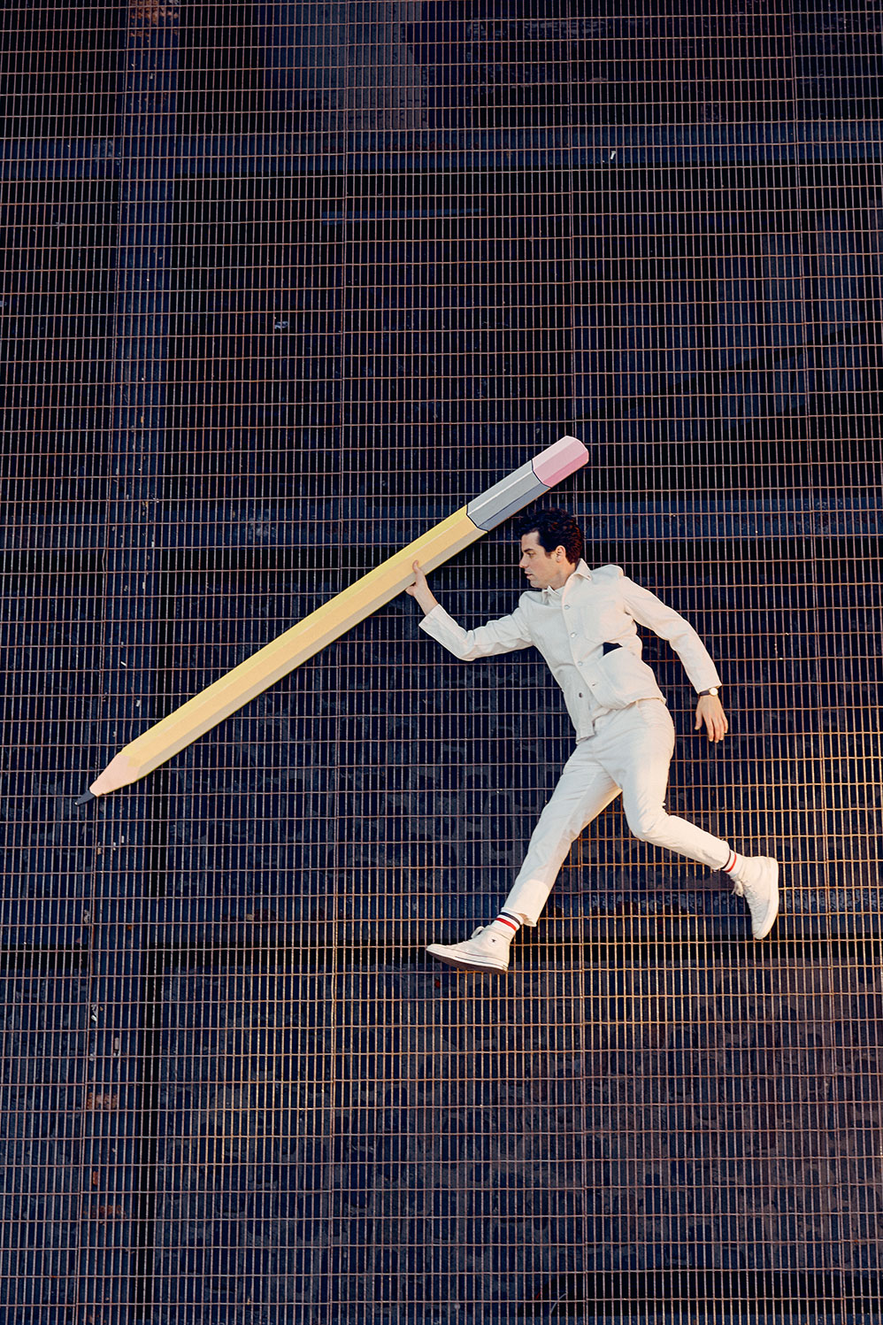 “I usually prefer staying on the opposite side of the camera, so I made a prop to create distraction,” he says, laughing and pointing to the 6-foot-tall pencil in the corner of his sun-bathed living room in Greenpoint. Originally drawn to the hands-on practice of graphic design, he found himself continuously stretching the boundaries of that field to include different mediums such as video and photography.