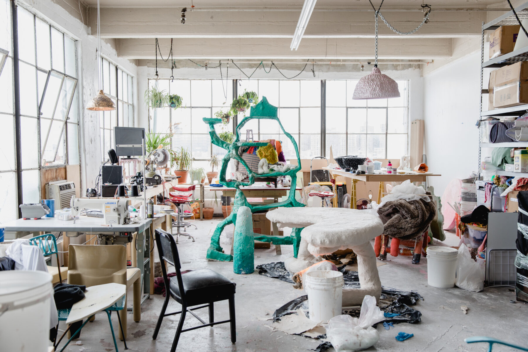 I found the space through a friend who had a studio space there before. But I have to move in six months, which I can’t even think about because it’s so hard to find space in Brooklyn. It’s so expensive! In order to find a space you have to just really spread your feelers and ask everyone. The space is in a large, bizarre building on the corner of Nostrand and Park in Bed Stuy. It is half Hasidic businesses and half artist studios. I’ve been there for two years but will get lost if I venture anywhere beyond the 1st or 6th floor where my studio is located. I rent a corner of the space out to a ceramicist and have two assistants, so it’s always a bustle. Even though it’s on the 6th floor, the traffic is super audible from the corner of windows. When it’s windy the windows visibly rattle, it creates the feeling of impending chaos that I imagine one feels on a ship before a storm. There’s something reassuring about how off-putting the whole experience can be, like if I get lost I know it’s only temporary and I know the windows won’t just break into a million pieces even though it sounds like they will. Also, I leave a lot of crap around my studio because I never know what I might need.
