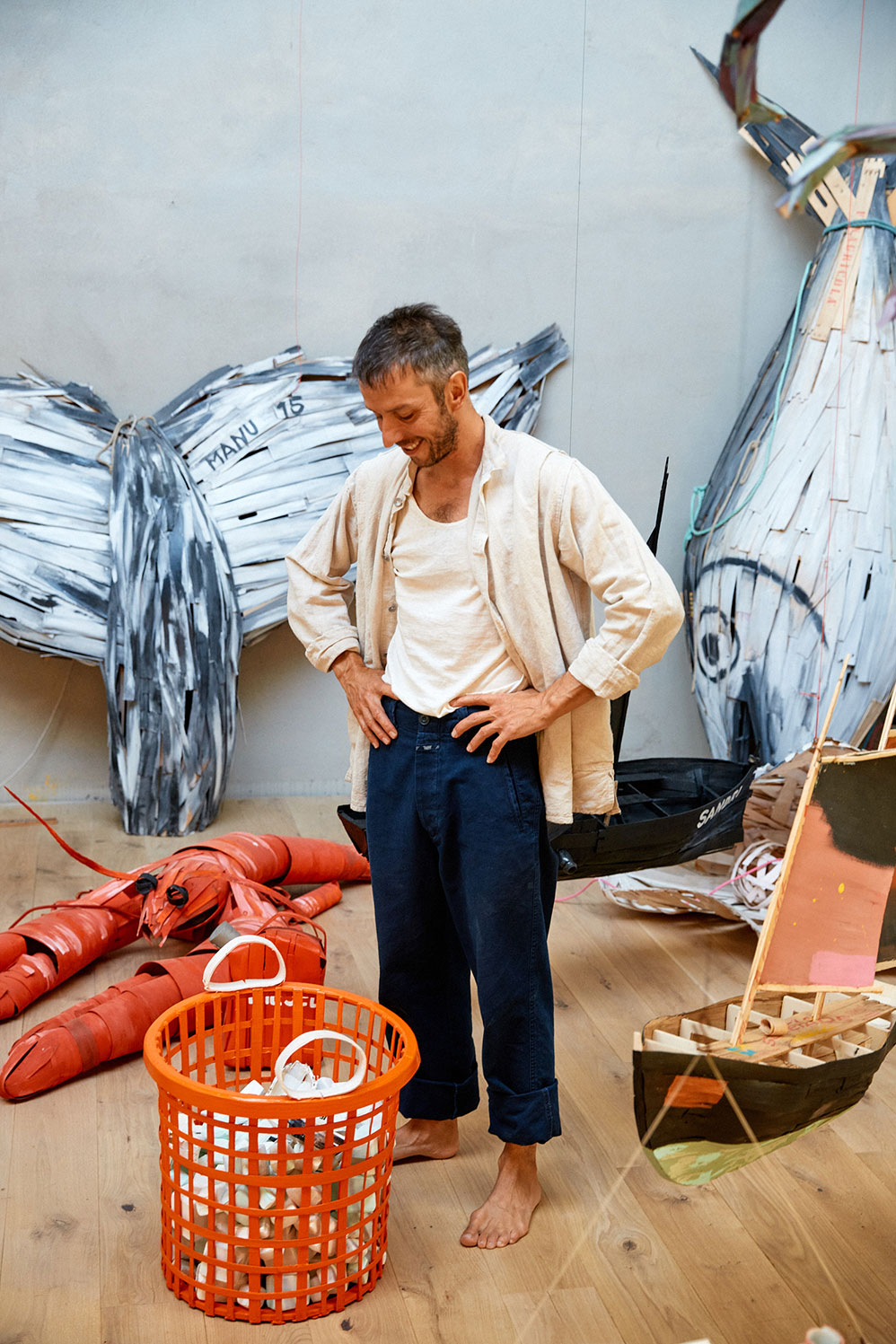 Mainly the space is embellished with their own artworks, but their love for quality and durable designs has led to a collection of pieces imbued with character dotted throughout the studio: a vase fashioned from the inside of a camel’s stomach, soap made with olive oil, a sepia-toned sofa languishing beneath towering sculptures, vintage battered suitcases perched atop the stairs. The idiosyncratic charm of the pieces are reflective of the overall playful atmosphere of their studio. It also underlines their shared interest in sustainability. Manuel’s sculptures are all made with zero waste, and many are notably constructed from fruit and vegetable boxes. Suspended boats of ivory and cerulean trim and bowling-ball sized strawberries alike are constructed with this particular wood. Manuel prioritizes creating art which can coexist in harmony with nature: “You are an artist, you are so free, you can do whatever you want, use the material you want…and still [artists] produce so much trash.”