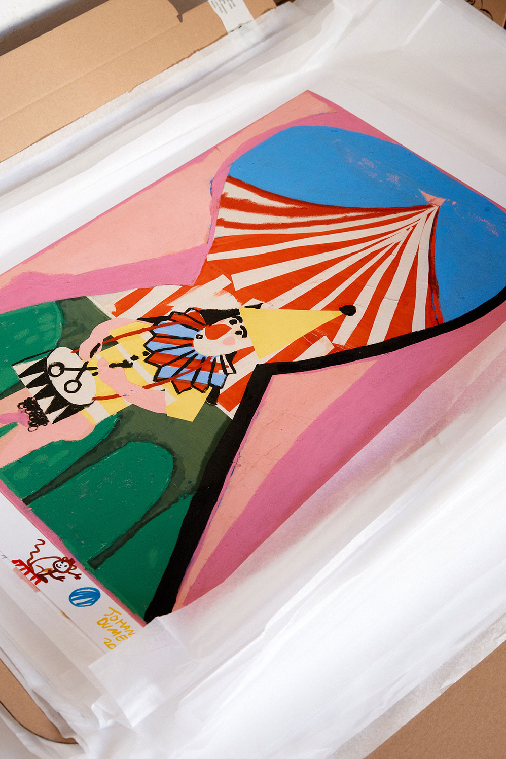 Typically, a day in the studio starts with the couple arriving on bicycle in the muted hours of the morning (unless they spend the night, as they do “once or twice a month”). Coffee is prepared and enjoyed by the kitchen counter, and then their work begins. Johanna generally stays on the ground floor, buffeted by swooping, animated oil paintings of gleeful clowns and thoughtful depictions of nude bodies. Manuel travels up the winding staircase to undertake his business on the top floor. Natural light fills the studio through impressive windows while music resonates through the open space. Manuel listens to everything from pop to classical music (noting Prince as a particular favorite) and historical podcasts as he works; Johanna oscillates between songs of her childhood, French cooking shows, and the Spice Girls as her backdrop, but occasionally opts for silence when a piece requires concentrated focus.