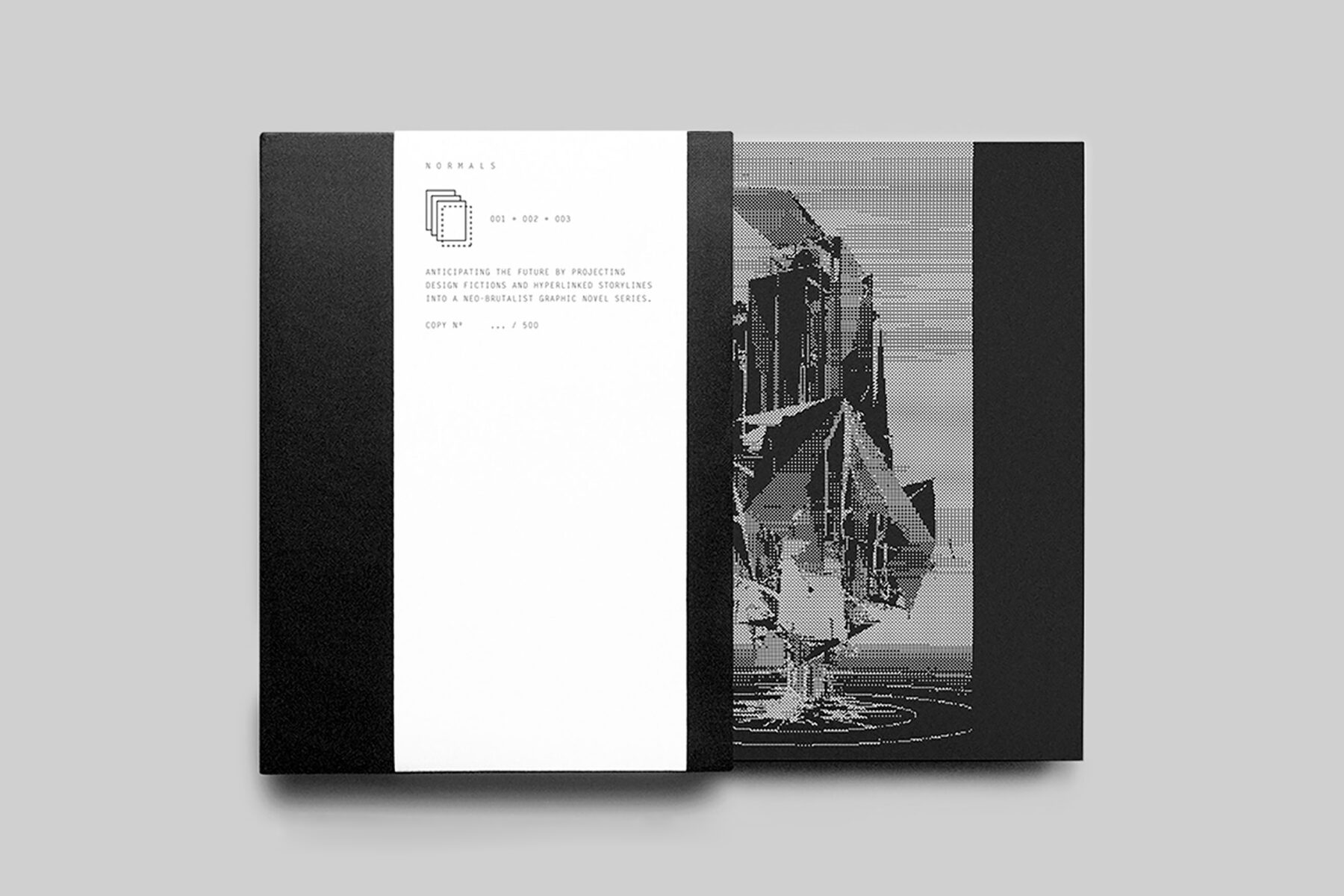 In 2012, when Flazinski first formed the studio together with Aurélien Michon (Lemberthe joined later), it found itself without a market. “At the time, design fiction was a tough sell and in order to explore this type of work we had to do so independently,” says Flazinski. “So we quit our jobs and used our savings to live and work together in a small Paris studio.” Here, following a strict creative routine (“Wednesday, for example, was ‘make up a fictional character’ day”), they began developing a design vocabulary through a series of self-initiated interdisciplinary works: graphic novels, music videos, card games, augmented reality fashion, which all narrated techno-futures in austere, lo-fi glory. “Our work is neither hopeful nor cynical and the raw mock-up aesthetic reflects that,” says Flazinski. “The objects we design function more like neutral placeholders for you to project your own morality into.” The name Normals was coined in a similar vein. “Most future talk gravitates towards either the utopian or dystopian with very little in between,” explains Lemberthe. “We are more interested in what a ‘normal’ future looks like and imagine it in sets of weird but mundane rituals.” True to form, their first graphic novel opens with a table replicating a cup of coffee.