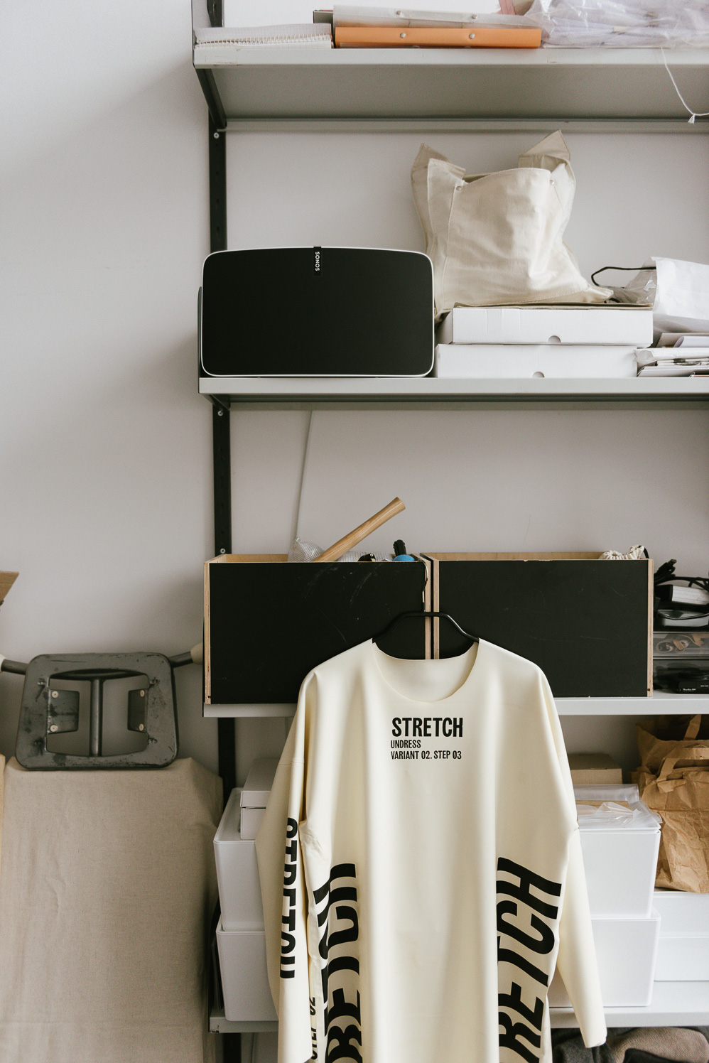“Just recently, there was a podcast interview with the editor-in-chief of the independent fashion magazine Vestoj,” she says. ”That of course doesn’t just play in the background but somehow also indirectly affects my work.” Nadine is currently tinkering with her new collection. Frequently, her work is more involved than simply creating a new pattern as Nadine designs complex structures and material solutions. “It’ll be a tablecloth line,” she says playing with conventions once again. “I like to question things. Tables are particularly steeped in a set of rituals.”