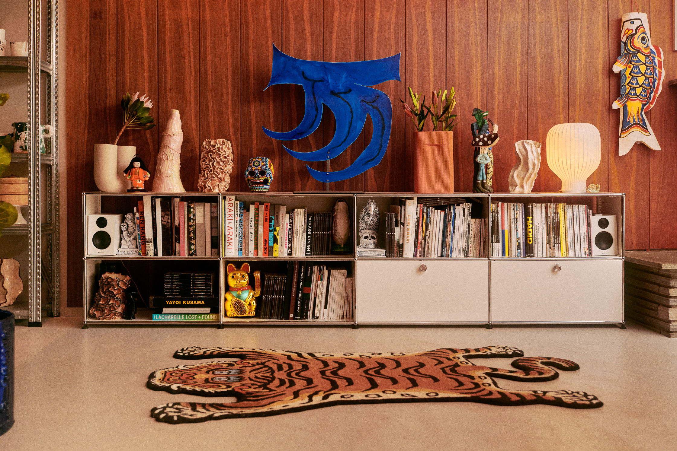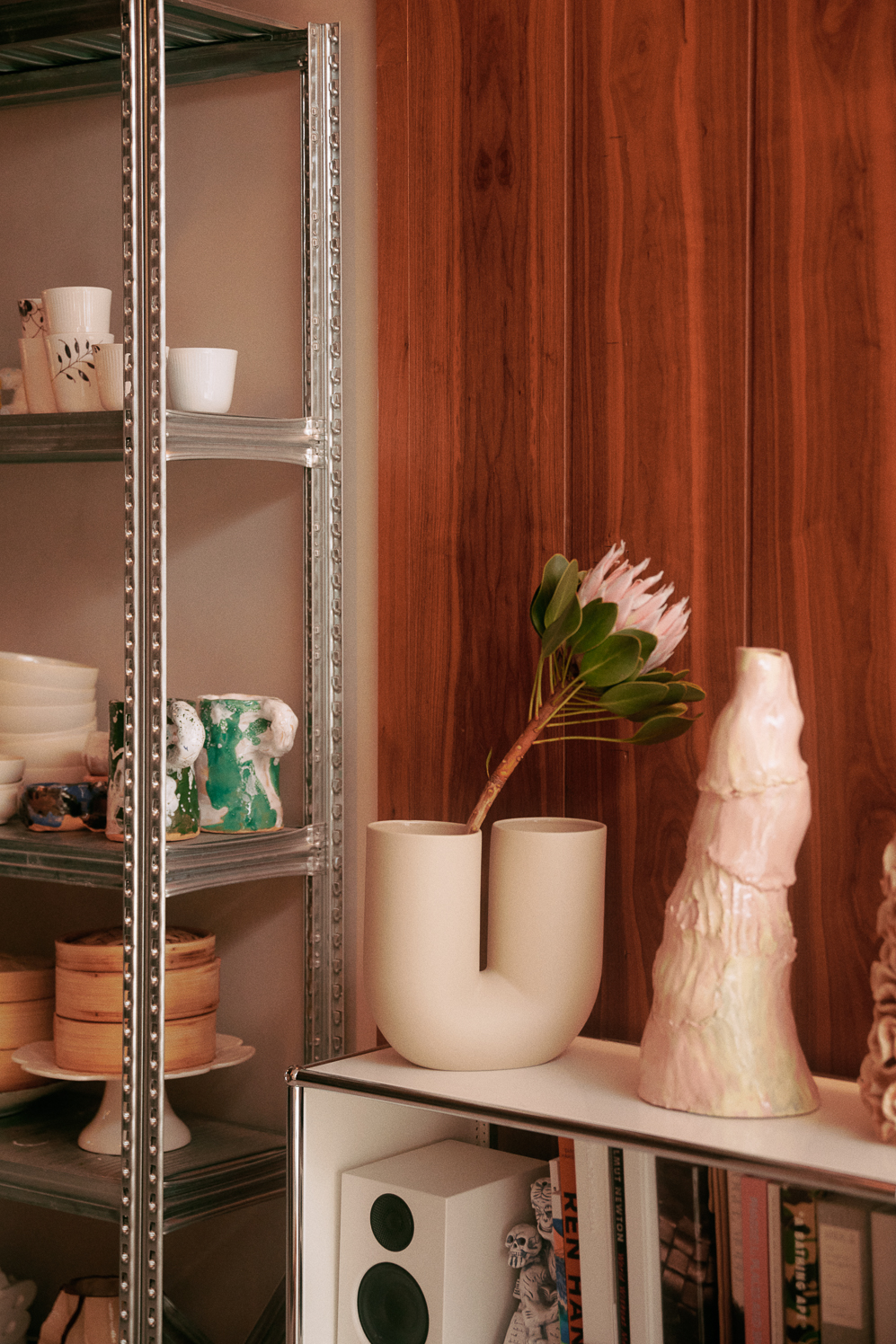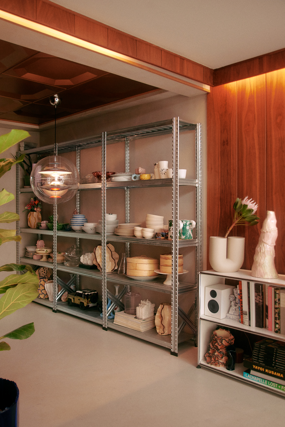 I like Japanese and mid-century design; you can see the personalities of Adeline and I in our interior. I try to purchase products that last, so they can move from home to home. Most of this furniture has been with me for almost ten years. We have some meditation-like floor pillows because we like to sit on the floor and eat at the coffee table. Adeline makes ceramics, so we have a lot of her ceramics at home. Sometimes they will be here for a few weeks, then they’ll sell, and we’ll have a new one. We combine light interiors with wooden panels, but we have a steel kitchen as well, so we break up the hard feeling with warmth and light. Because I spend so much time every day here, it’s almost like my playground for inspiration. If I get creative block because I’m spending too much time online, I go to the shelf and take out an old magazine, or go for a walk. I’m always trying to curate the things we have because you come to a point where you don’t need more stuff. How much stuff can you fit in a house? I’m trying to be more selective, to create emotional memories with the stuff we already have. It doesn’t need to be expensive, but it has value to me.