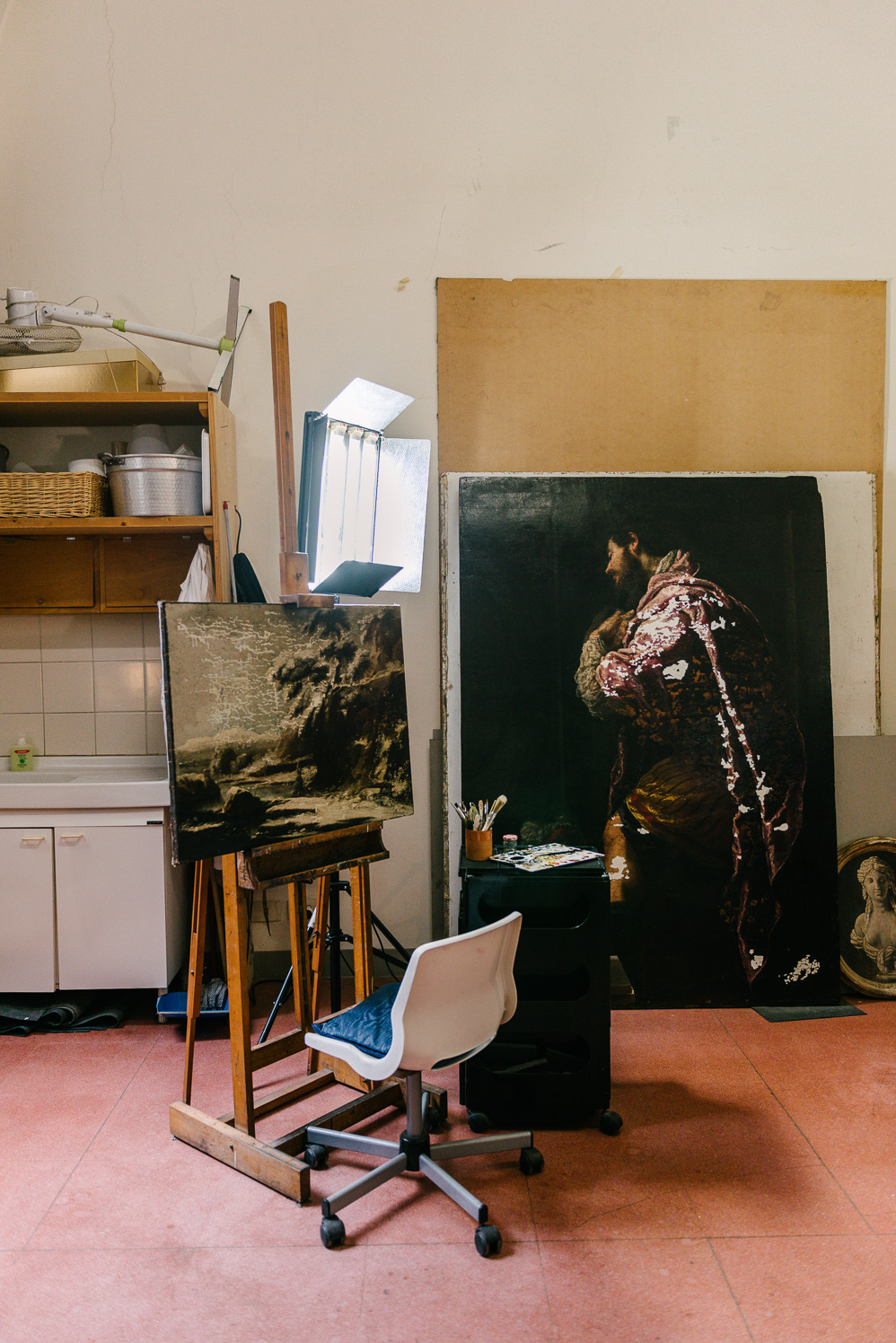 The work of a conservator—of bringing the past back to life—is a delicate one as it is. Walking a fine line between preserving what is there and recreating what is lost. But the work that Lorenzo does is something else entirely. When paintings arrive in Lorenzo’s studio, the paint may be peeling away from the canvas, or patches of the canvas may be missing entirely.