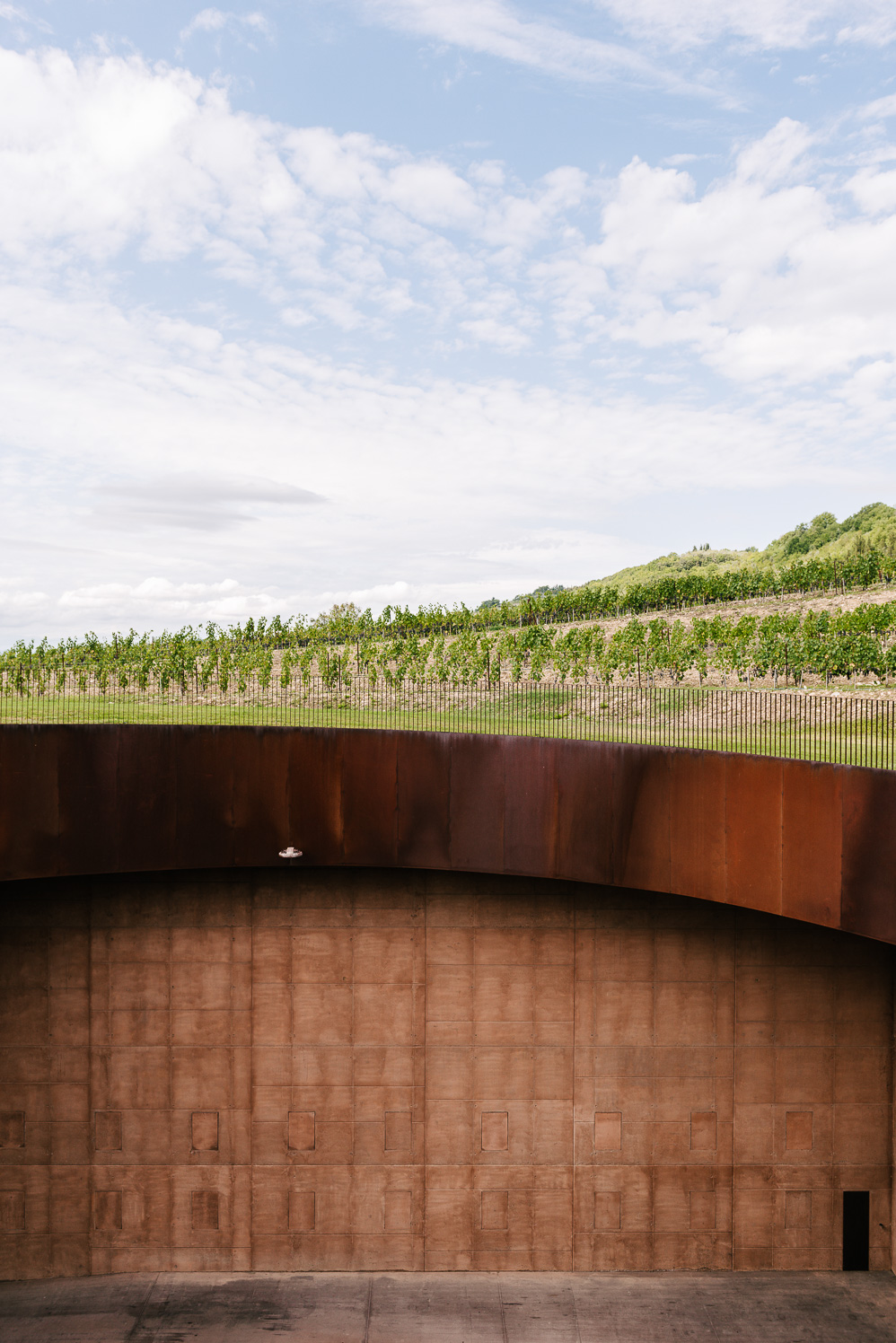 It looks sort of like the headquarters to a villain in James Bond—with naturally weathered steel forming the skeletal structure of the building, filled in by the red Tuscan tiles that match the color of the soil. The business is certainly deserving of the distinctive architecture: founded in 1385 by Giovanni di Piero Antinori, the family business has been making wine in the region since, as the tenth oldest family-owned business in the world.