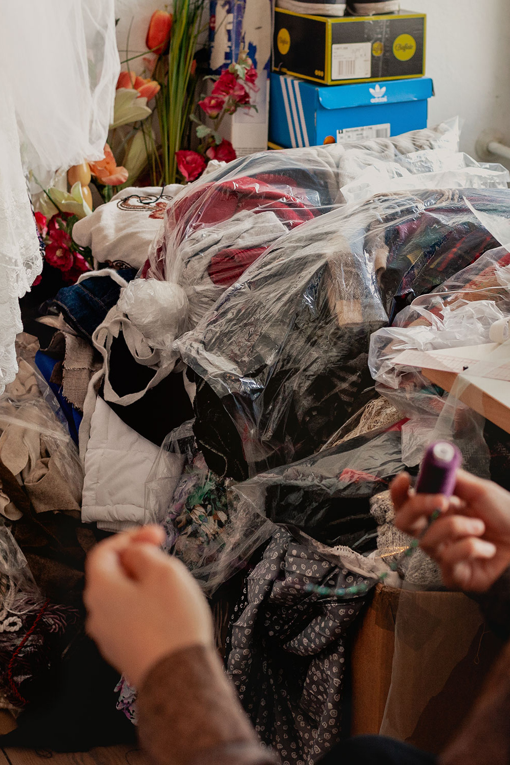 The Neukölln residence of Odély Teboul is a feast for the eyes. Every inch is covered with stuff: collections of pom-poms are strung over door handles, colorful crochet blankets and floral cushions are nonchalantly thrown over armchairs, and extensive piles of old records are stacked up against the white walls. Two rooms at the back of the apartment function as a studio for Teboul. In one, there’s a clothes rail choc-a-bloc with vibrant outfits ready to be sent off to Paris Fashion Week. In another, a wooden grid of shelves holds a wide array of bric-a-brac, from naked, bent-out-of-shape Barbie dolls to bags upon bags of Swarovski crystals—seemingly natural possessions for a fashion designer whose work explores themes of decadence, extravagance, and chaos. “I think chaos is very representative of me as a person,” says Teboul, laughing as she surveys her surroundings.