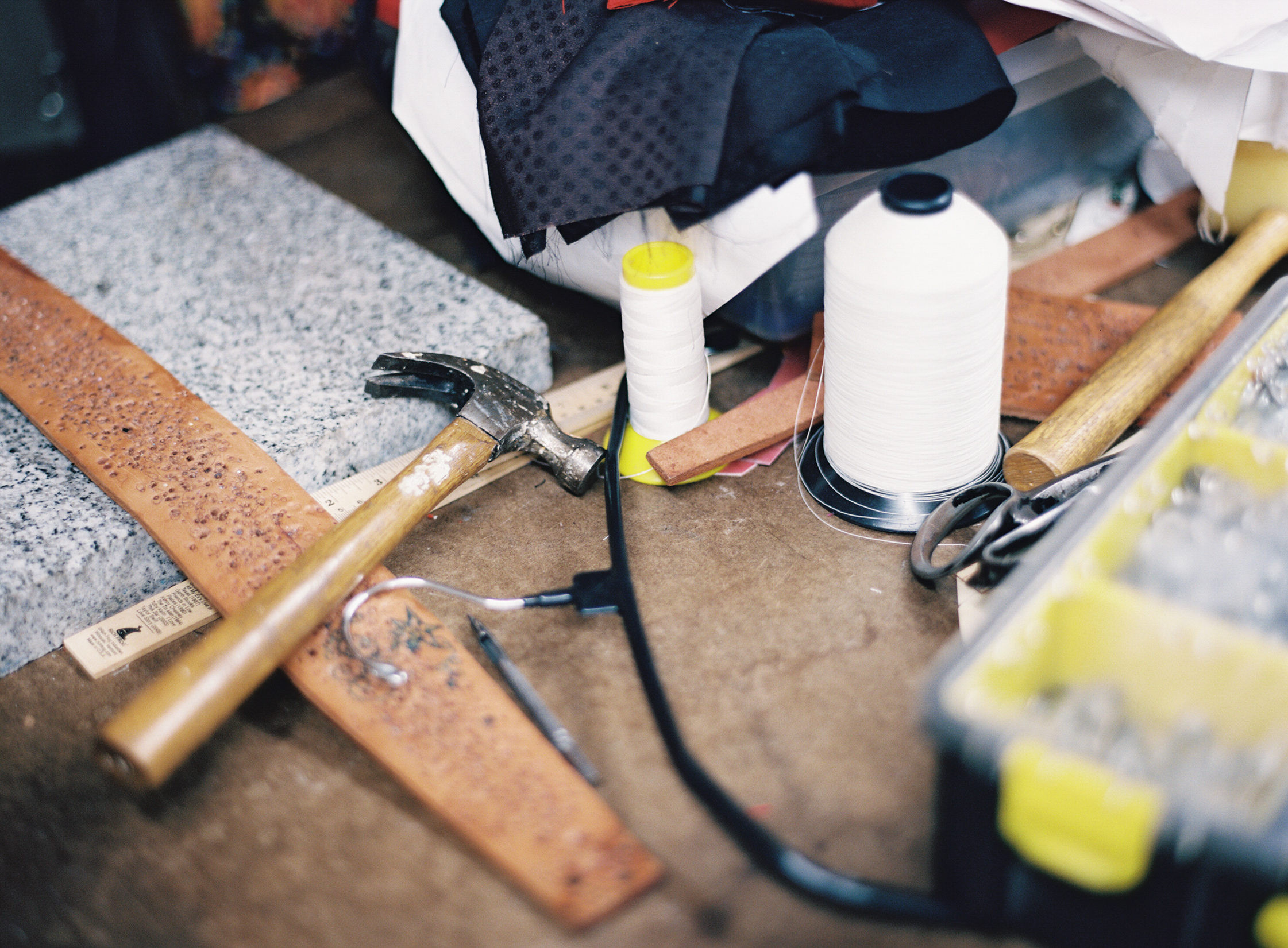 I know how to do every damn thing you see in this shop. I design everything, I do the drawings by hand, I do the sewing and stones and leather. We start with something that’s like a drawing. I draw it out on paper first by hand, and then it becomes a sketch of what we embroider. On my new one I’m doing today, I have this skeleton sketch. See, here! The skeleton is smoking a little grass! So then we take the drawings, and we puncture them into the fabric. We draw the back part of the jacket, the sleeves, the front and the bottom all on paper. Then we perforate. When it’s perforated, it gets little speckles on the fabric. It’s done with a hammer. You’ve got to have imagination for this. Then we use the rhinestone machine. We embroider. We put it all together. Yes siree – it’s like magic!