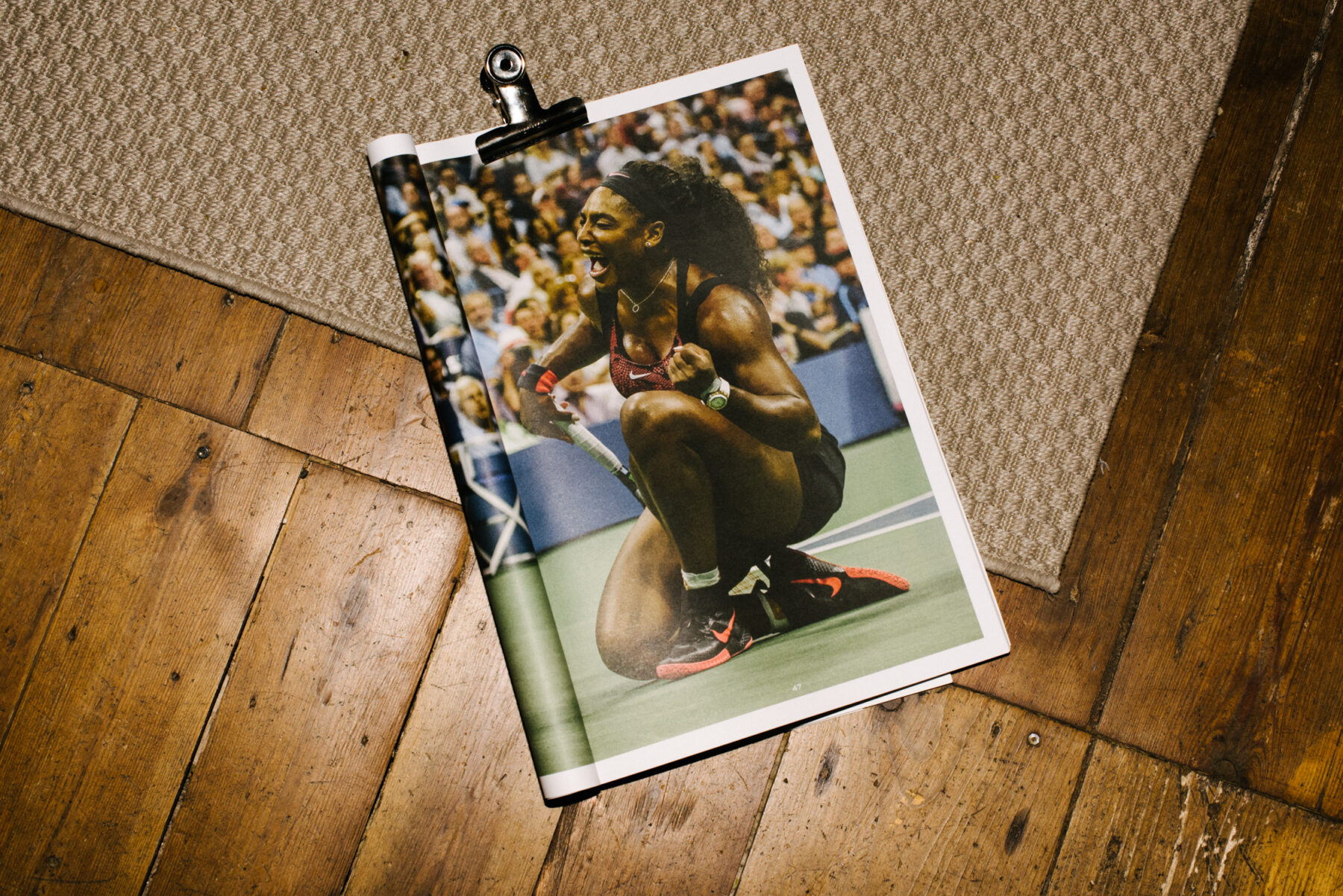 The single piece of editorial flamboyance is the opening page, where ‘The Ten’ offers a list of ten words that together sum up the whole content. The tenth issue boasted, ‘Pharoah, Disguise, Ascension, Slapshot, Venus, Carnage, Talese, Pettibon, Plaster, Memphis,’ alluding to stories ranging from Raymond Pettibon’s sports drawings to a photo report from the Williams sisters play-off at the US Open, via American Pharoah’s triple crown string of race victories and the strange tale of basketball venue Memphis Pyramid.