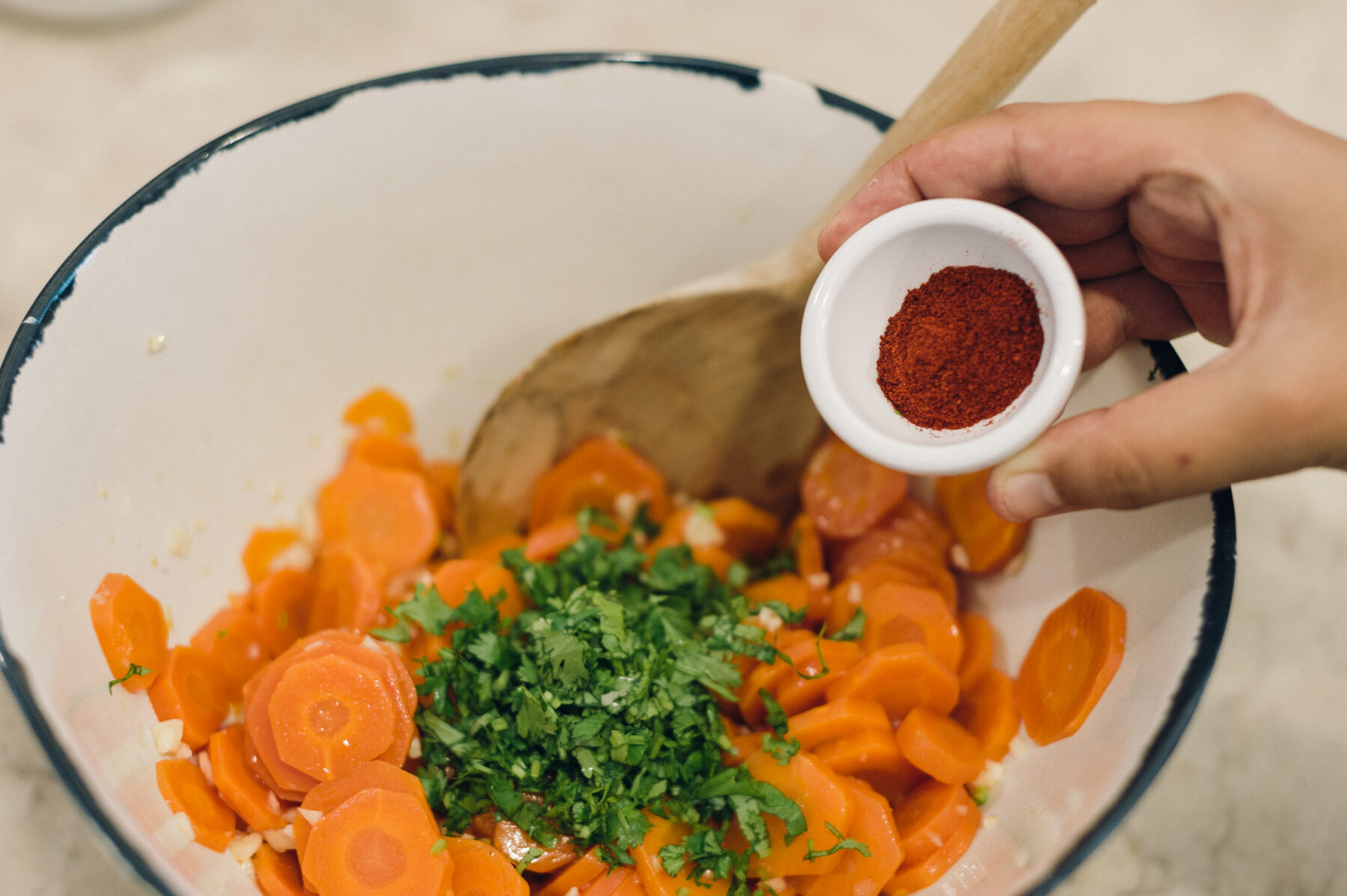 - Season with salt, paprika, olive oil and finely chopped coriander.
