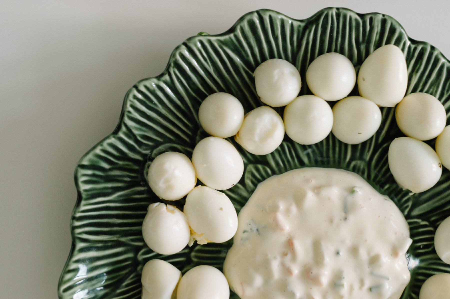 - Carefully peel the quail eggs and serve with a dollop of mayo.