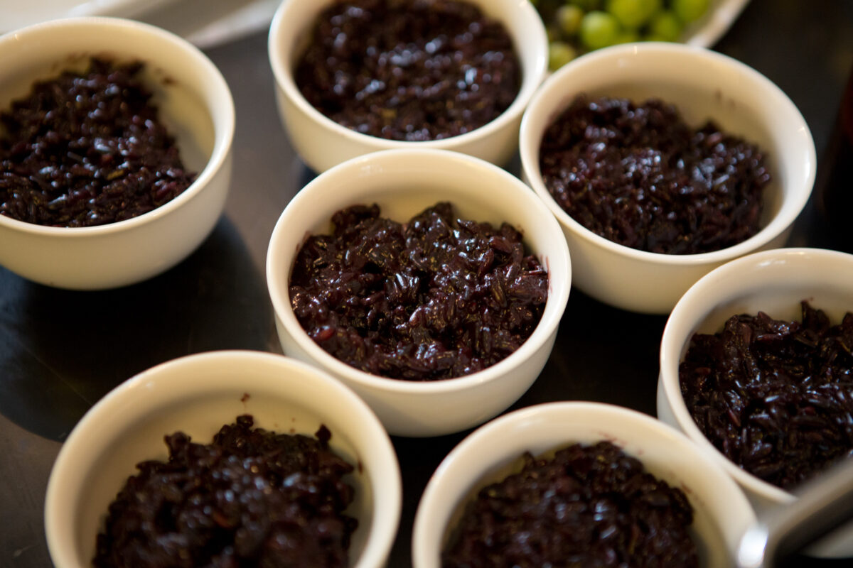 Lunch reaches its pinnacle as the summer rolls disappear from the table and warm bowls of curry begin to appear from the kitchen. For the main entree, we are treated to an Autumn Vegetable Green Curry, served over creamy rice that is gently sweetened with coconut milk. The room is crowded with our team members, who eagerly spoon up pieces of eggplant, fried tofu and sweet potato. Thanks to the addition of both green and red chillis, the dish has a pleasant heat, a fundamental component of Thai cooking. To finish the meal, the chefs serve glasses and ramekins filled with Sweet Black Rice, complete with coconut whipped cream and slivers of fresh corella pears.