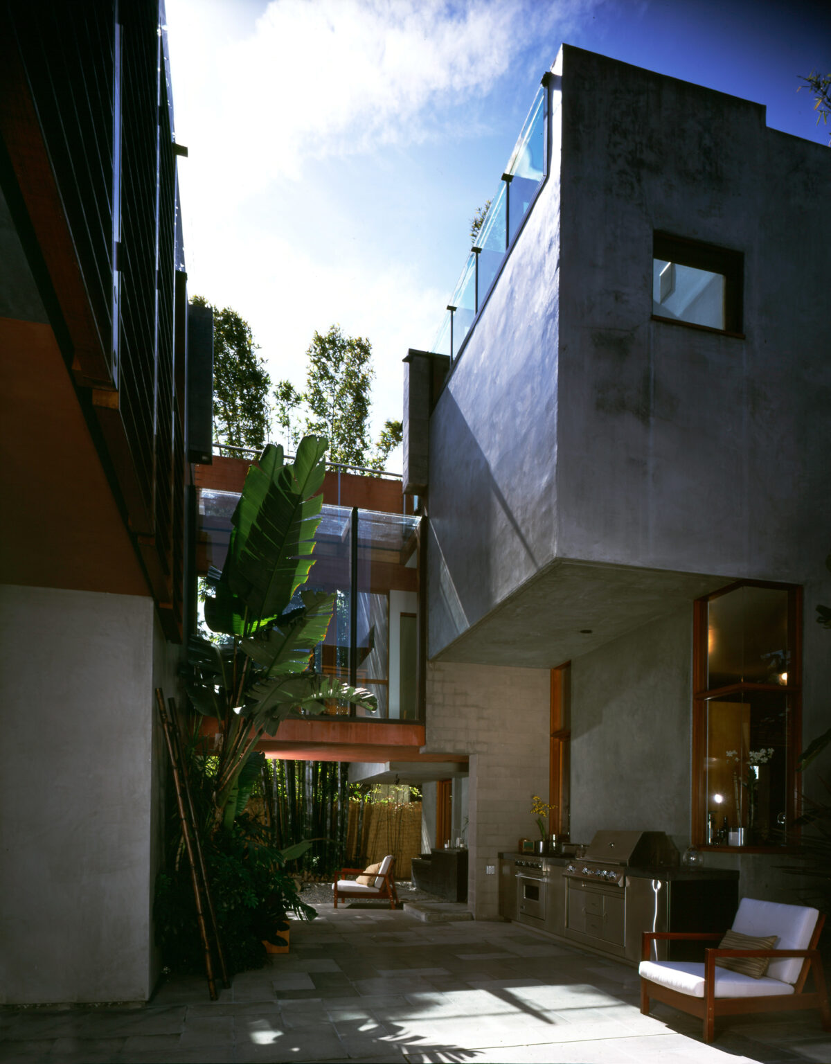 For this event, the ‘Californication House’ or ‘McKinley Residence’, coined for its routine appearance on Showtime’s Californication, provided the perfect environment – the warm wood tones, high ceilings and subtle integration of outdoor space proved galvanizing, as guests from all walks of life gathered at the long table. Tucked behind a wall of lush flora, the eco-friendly brainchild of architect David Hertz, the house boasts a compound made up of four discrete two-story buildings linked by three enclosed bridges that all face onto the courtyard, in a style one might call Balinese Modern.