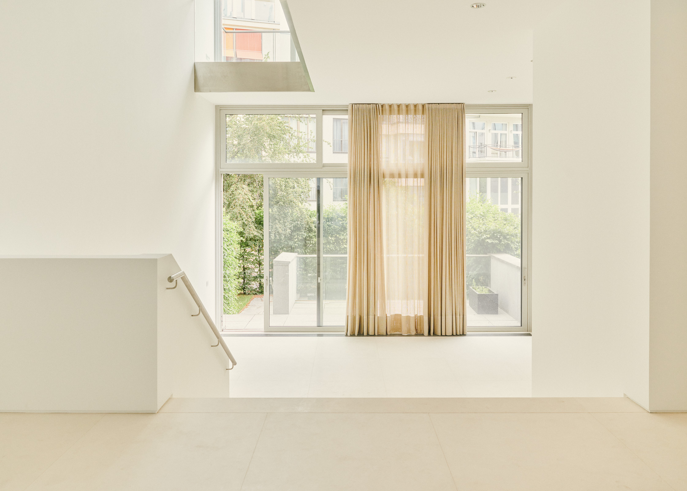 The exterior of the townhouse is adorned with a glazed facade of glass and stainless steel, while the slenderness of the structures are accentuated through a single-flight staircase situated at the center of the design. With natural light permeating from two cardinal points, each floor highlights the exceptional ceiling height of the building. The building also consists of three balconies on each level, offering fresh air and serene views of the surrounding area, including the iconic Berlin Fernsehturm. An incredible rooftop terrace provides a panoramic view of the city.