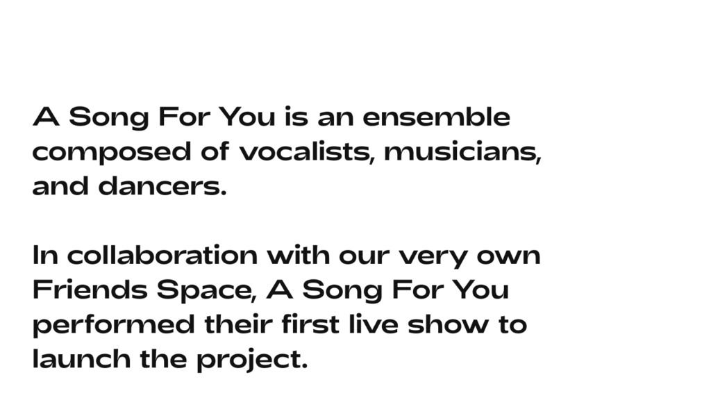 A Song For You is an ensemble based in Berlin, founded by Noah Slee and Dhanesh Jayaselan. At the heart of the project lies community and collaboration, as vocalists, dancers, and musicians come together through their love for rhythm and melody. The images have been taken from their debut performance in the Friends Space.