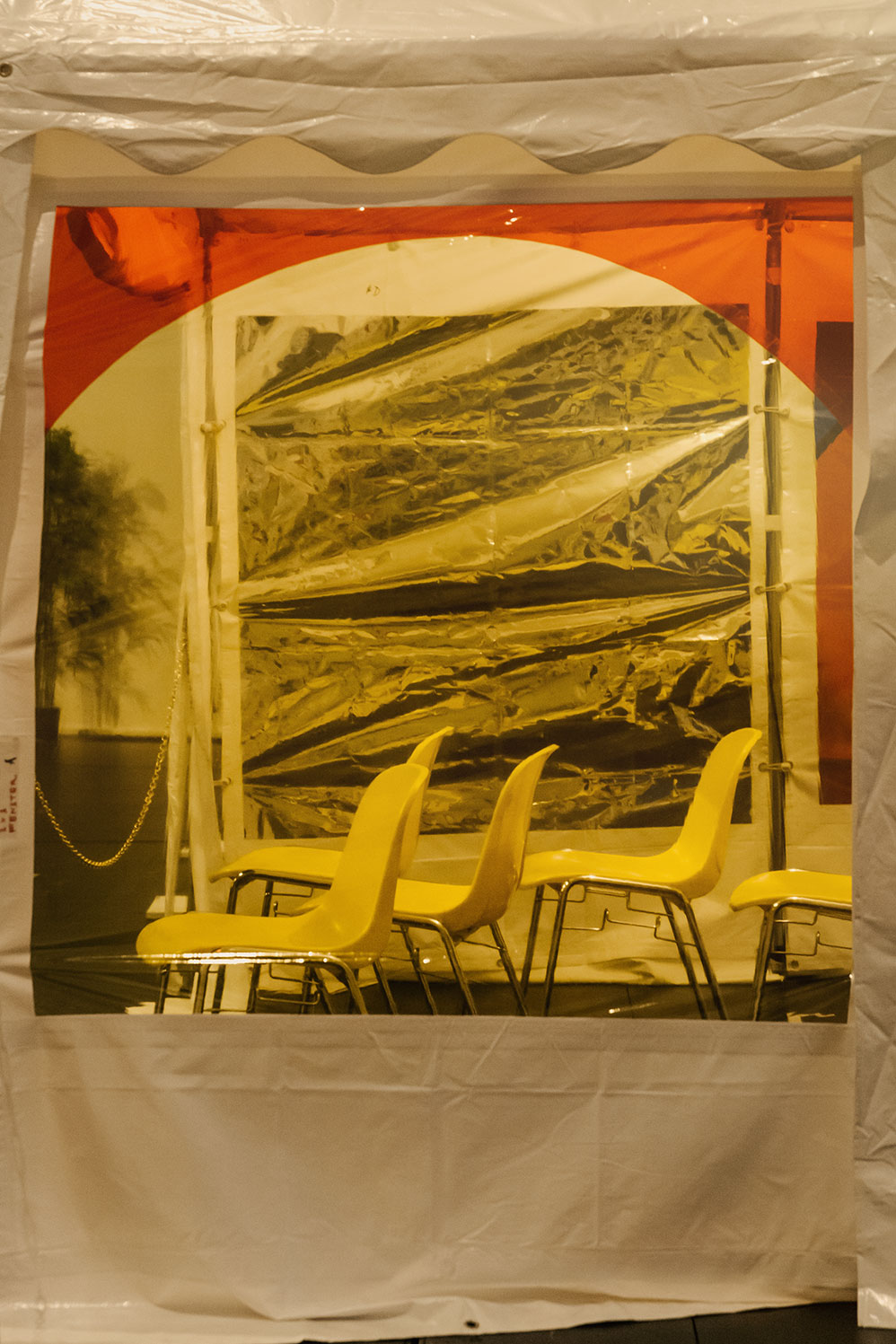The initial concept for his current project came out of projekt bauhaus, a consortium that’s managing and hosting events around the design school’s 100 year anniversary. “They approached the people at Volksbühne and they thought it might be a good idea to ask me,” explains Kamerun. Initially, he felt “afraid” of the celebratory tone of the centennial and wanted to examine how much, if any, of the initial spirit of the Bauhaus still existed today. “I wondered why I should join this party at all. So, we came up with the idea that we should bury the Bauhaus to really free it. The idea was born to call it a requiem.” Accordingly, the piece is to be understood like a playful burial ceremony for the Bauhaus and will comprise a party, a series of performances, musical installations, and interventions. On the main stage, they’ve installed a camp made of tents. Der Grüne Salon, one of the Volksbühne’s side stages, has been turned into a sports studio for abstract dance, with the space outfitted with an arrangement of levers and covered by transparent awning in blue, red and yellow, the colors of Bauhaus. The Sternfoyer of Volksbühne was turned into a performance space for live music, which will include an opera singer and a musical performance by Kamerun himself.