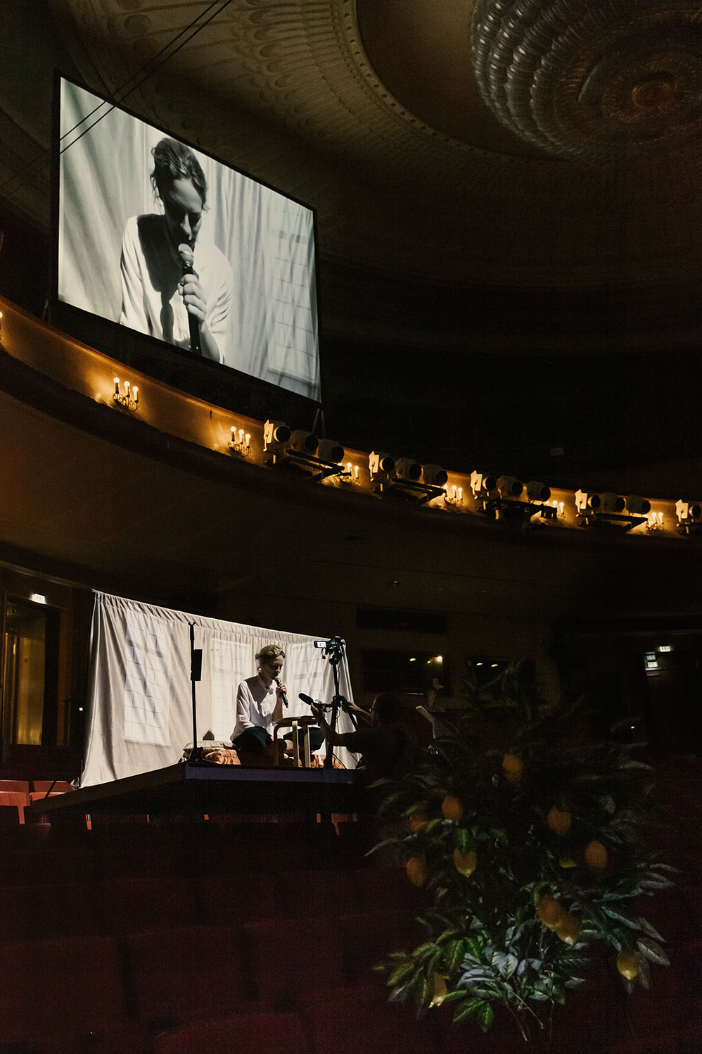 The Sternfoyer is transformed into a performance space for Schorsch Kamerun, an opera singer, a piano player and other musicians.