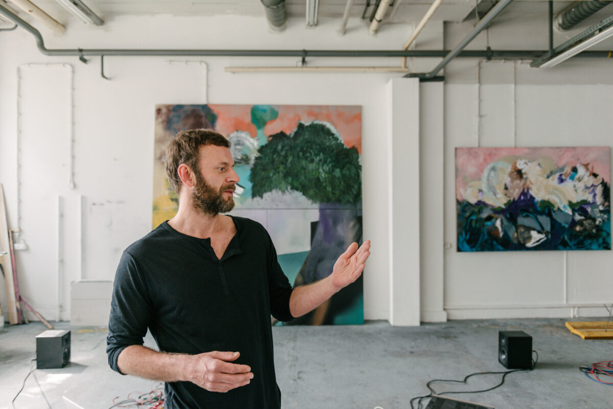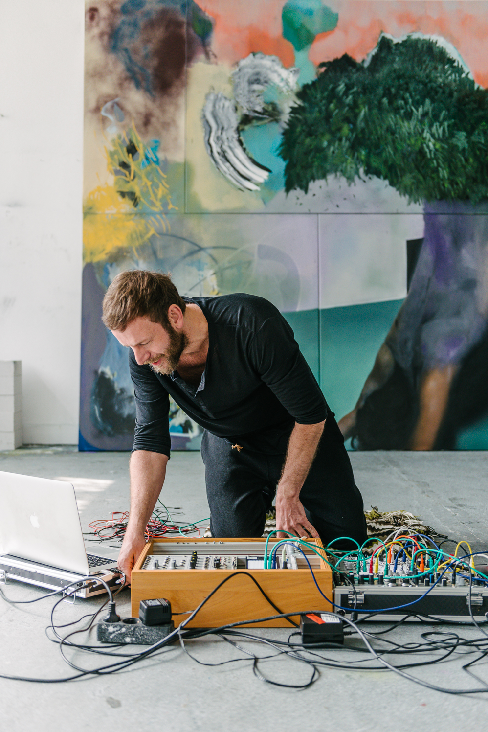 Markus’ modular synthesizer lays on the floor within striking distance of an unfinished painting depicting a tree in an abstract plane of color and motion. “I used to only come here for painting but my inspiration comes from sound, because that’s my background. So I thought, why not bring them together in the same space? With painting, there is this feeling that something will happen but you don’t know what. And this is how I work with music because it’s very improvised. So this is something I’ve transferred from my music to my painting.”
