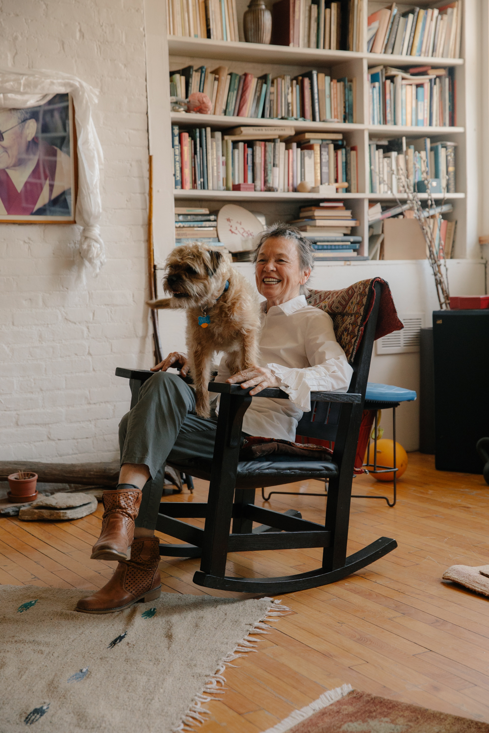 We’re sitting in a book-filled room in her multistory Tribeca loft—a warm, tasteful-yet-unassuming space that she has resided in for more than two decades. Little Will, her beloved border terrier, is never far from her feet. Downstairs is her recording studio. Another room houses 3D printers, equipment, and instruments—a tableau of buttons, cables, and knobs. The entrance hall is filled with objects that demonstrate her exuberance and abiding curiosity: a skateboard (yes, she uses it), ice skates, a fold-up bicycle—another bicycle with a yoga mat in the rear basket. Her main living space exudes Zen minimalism, as if Anderson (an avid meditator) only lives with things that are essential and personal, like her Takashi Murakami toys, a hand-carved wooden stool, and a Mexican blanket fashioned as a rug. It’s an apt reflection of her personality: no-nonsense yet endearing. There are small shrine-like tributes—most prominently, a framed photograph of His Holiness the 14th Dalai Lama, draped with a piece of white silk. A few photos of Lou Reed are mounted on the walls, fairly inconspicuously. It’s pretty trippy (and utterly heartwarming) to see iconic images of an iconic rockstar recontextualized as family portraits of a loved one.