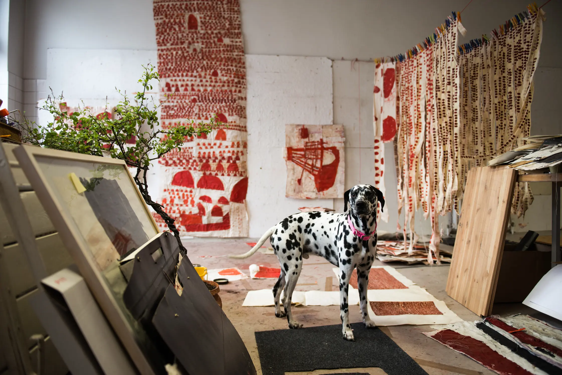Here, an aesthetic chaos reigns, made of paper works, painted strips of fabric, working materials and palettes of hand-mixed oil paints. It’s here that Zech devotes herself with great energy to her Bollenpaintings, a series of works in which round forms of different sizes, aligned at varying distances apart, come to life in vibrant red. First exhibited at the Heidelberger Kunstverein in 2006, the works have since been thought out into new directions by Sati.