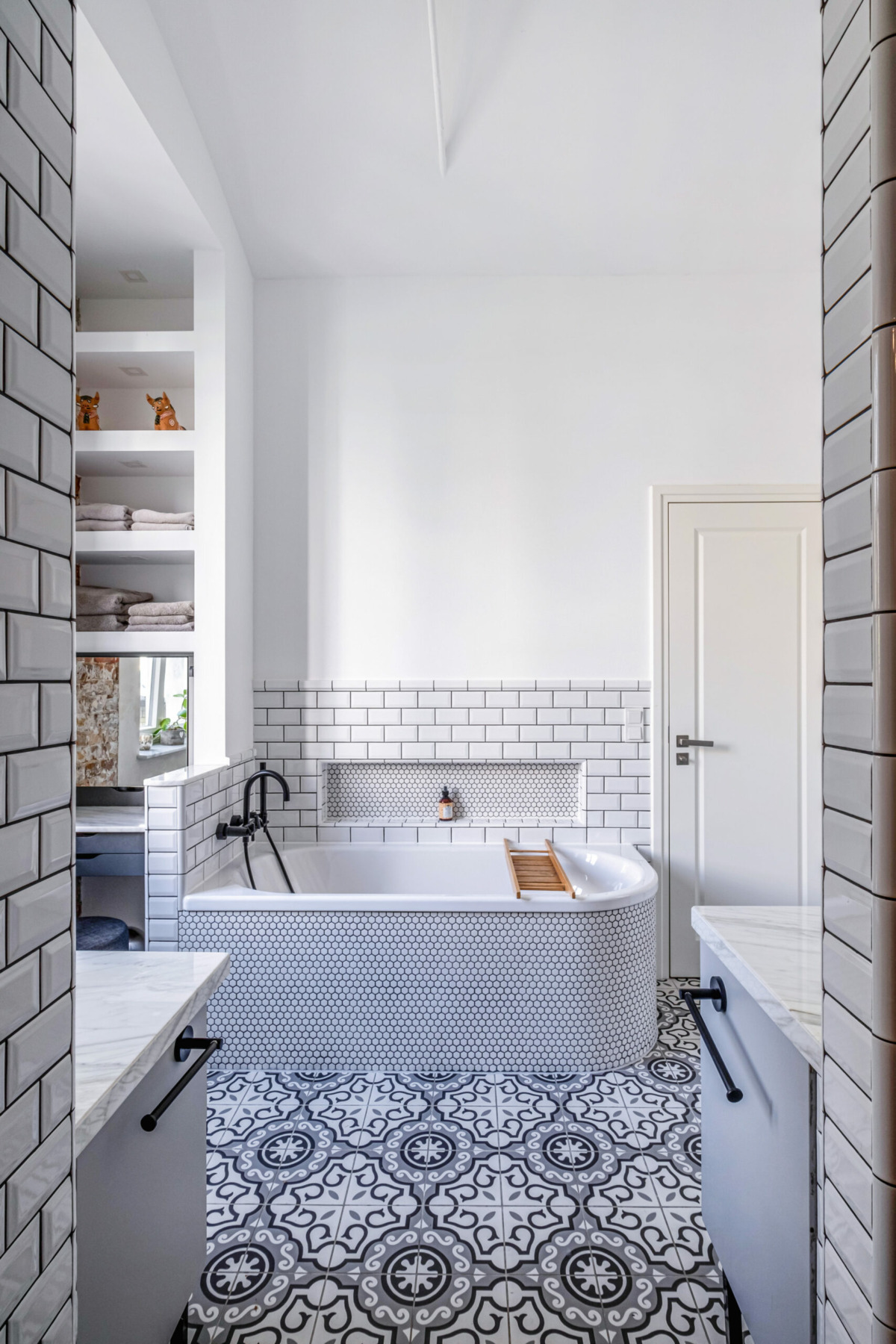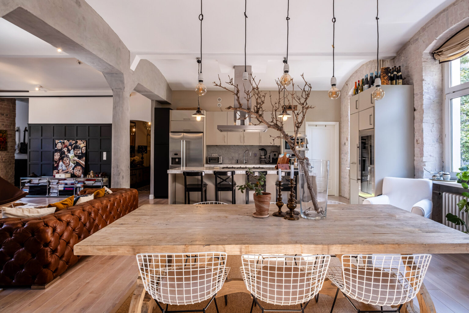 This recently renovated loft apartment offers a range of spectacular living spaces and boasts elevator access. Situated on the second floor, the apartment imbues a unique charm derived from the compelling fusion of modern, high-quality interiors with architecturally captivating historical elements. Prussian vaulted ceilings and refurbished, cast-iron pillars create intriguing perspectives, lending structure to the spacious central area that is bathed in natural light. This versatile space accommodates living, cooking, and dining and provides the perfect backdrop for shared moments with your loved ones.