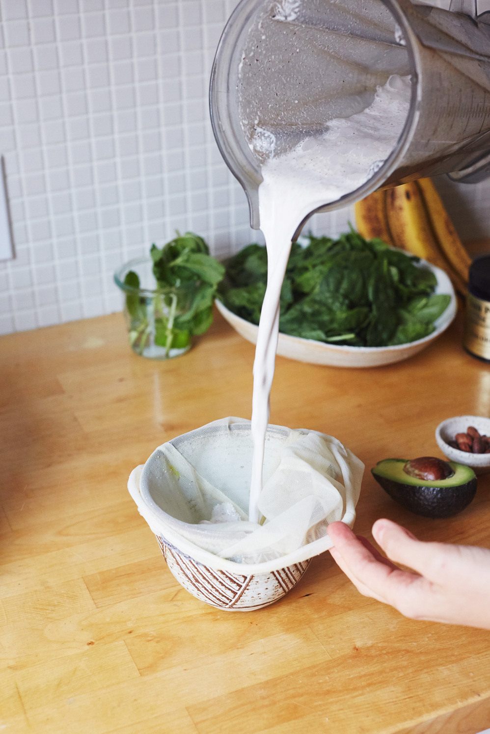 Add the pistachio milk back to the blender with the frozen bananas, tahini, dates, cardamom pods, lemon juice, vanilla, cinnamon and salt. Blend until creamy.