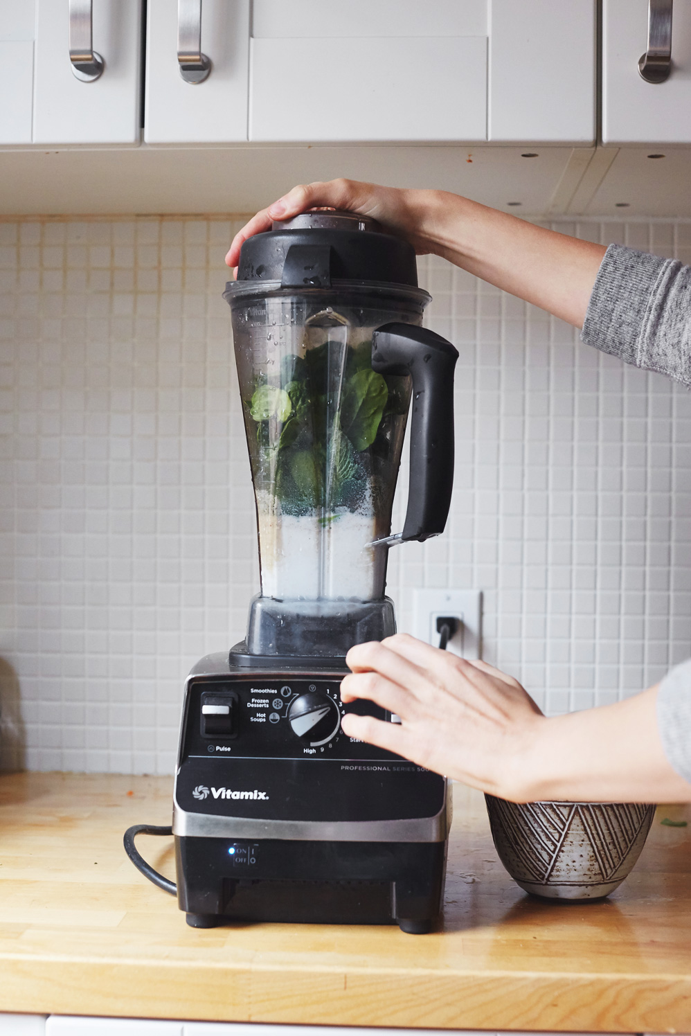 Add the bananas, spinach, avocado, dates, mint leaves, cacao nibs, vanilla and chlorella. Blend until creamy.