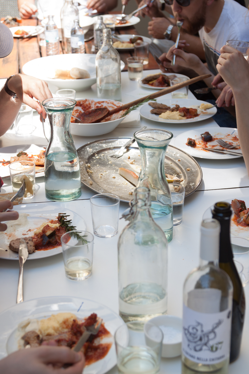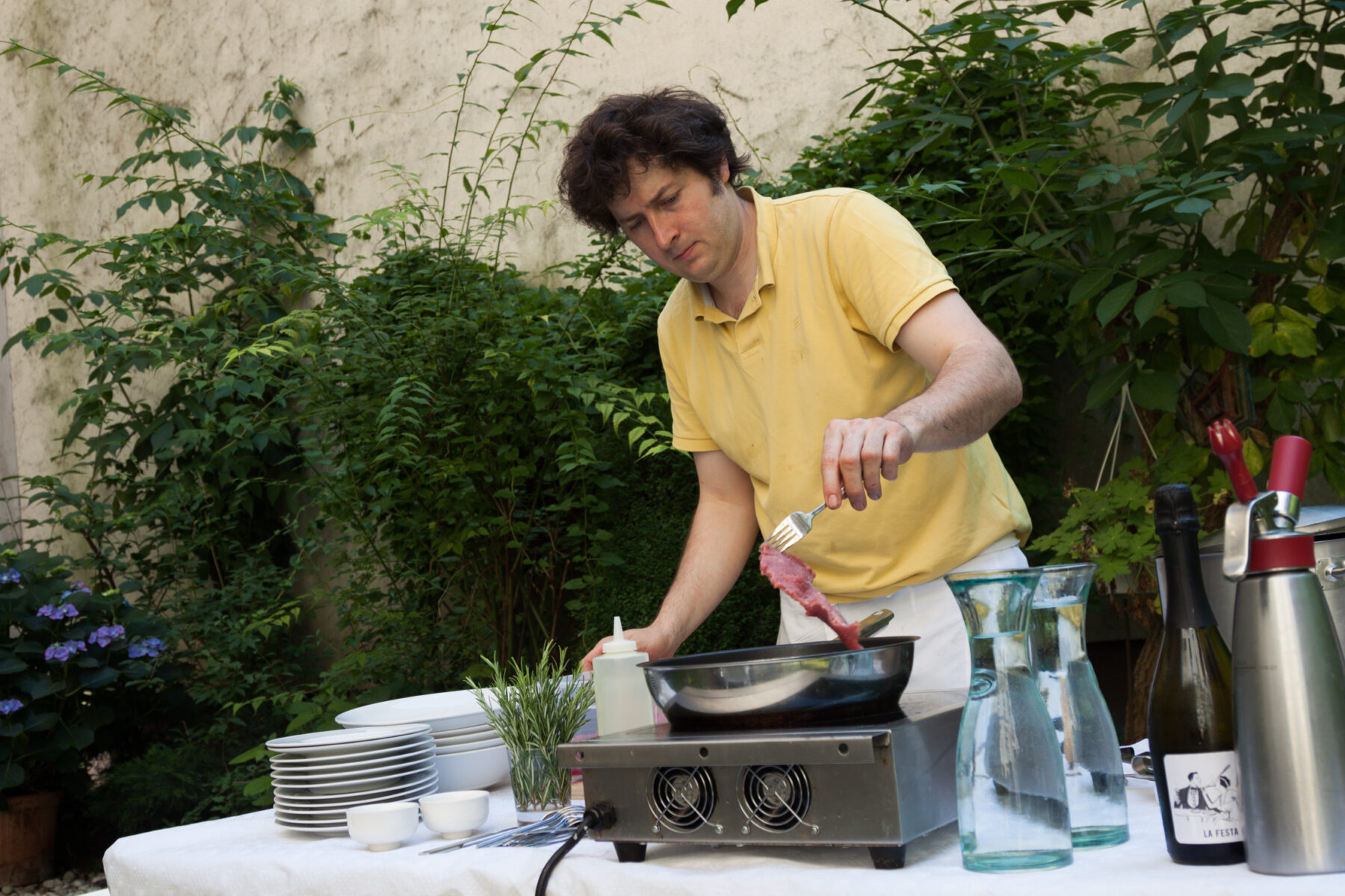 Setting up an electric hob in the garden behind the FvF Apartment, artist and chef Max Frey prepared tender veal steaks for the whole team. On a warm July afternoon, Max fried the slim steaks while we finished up the savory pear salad. The steaks were complemented by sides of creamy polenta and aromatic ratatouille.