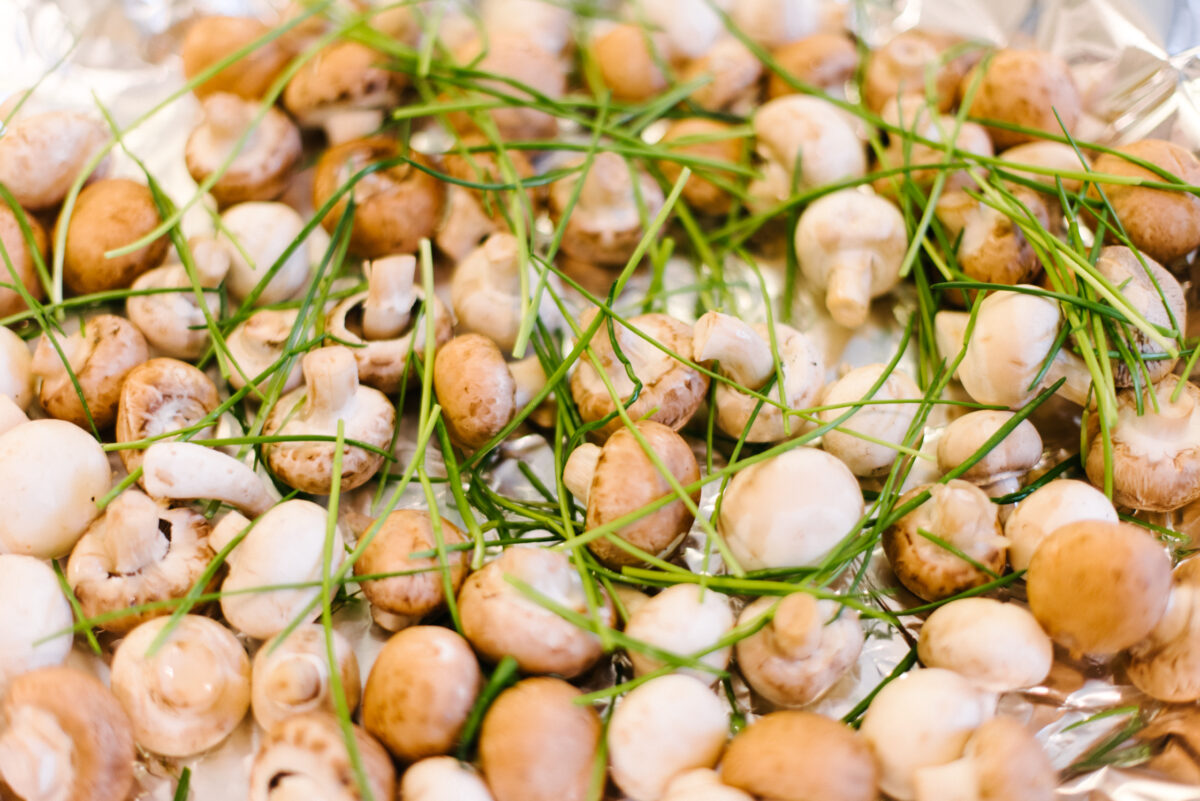 - Place mushrooms on a baking tray (champignons and shiitake whole; king oyster cut into thick slices)