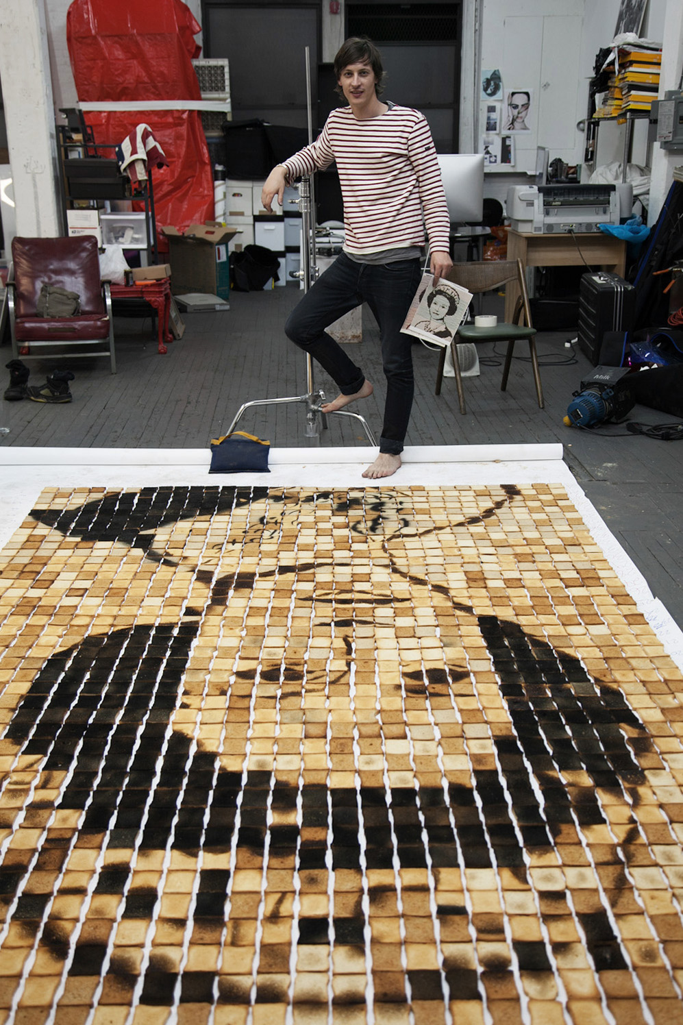 Much of this work takes shape ten minutes from his apartment, at a Bushwick studio whose towering windows and vast expanse of blue-gray flooring are – to the eyes of anyone accustomed to the city’s narrow confines – a surprise in and of themselves. In the corner sits a cluster of boxes, full of materials for an upcoming project on the meals of doomsday preppers. There’s a ladder propped against the wall nearby, alongside tubes and poles and slabs of wood. Things here are in a state of constant change, Henry notes. New things in, old things out. “That’s a process,” he says, “that doesn’t end.”
