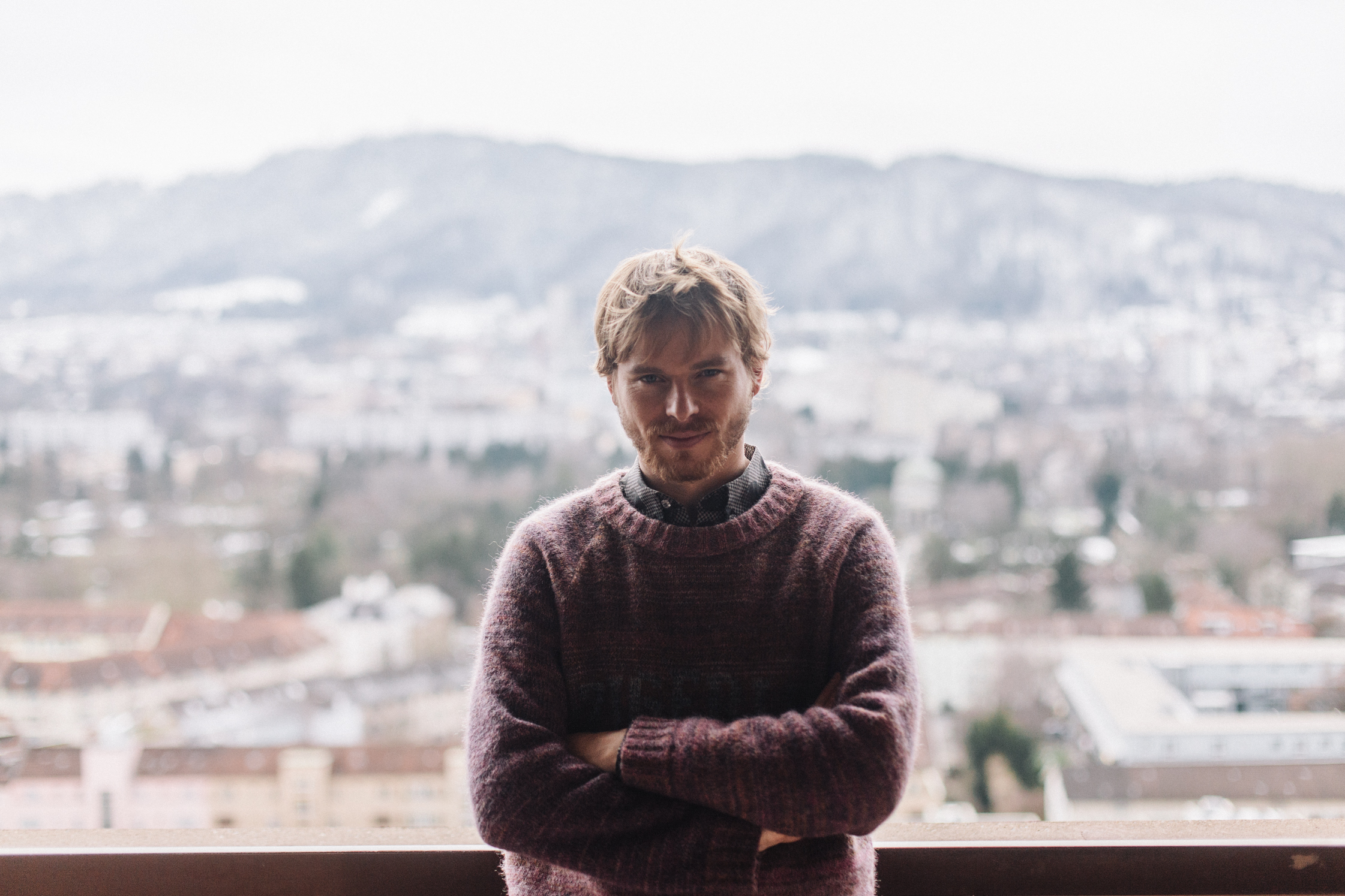 Our talk with Julian Zigerli ended in his favorite place – the Sports Bar in Zurich’s multicultural 4th district, with a beloved-by-the-Swiss Schinkengipfeli (ham croissant) and a cup of coffee. Our walk leads us over the Hardbrücke, where the Prime Tower rises into the sky and the train station’s tracks create a mosaic. The days slowly darkens. In the café Julian taps at his cell phone. He says, “We’re going out again tonight. Are you coming with?”