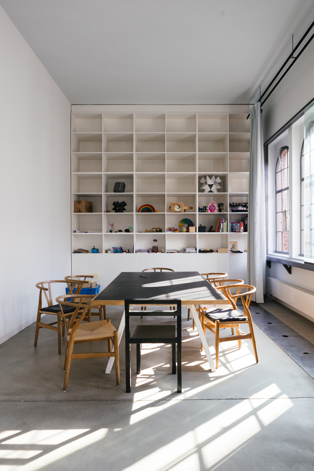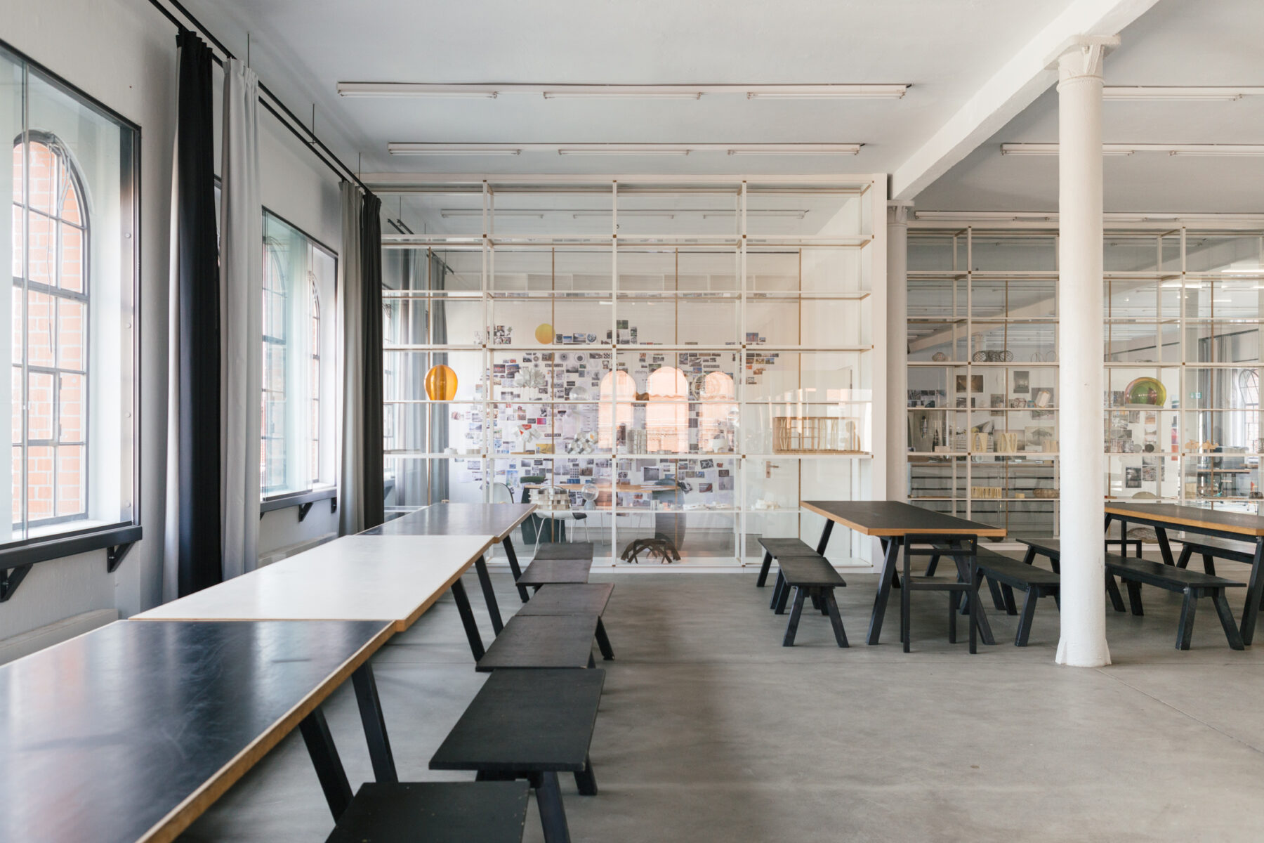 The light-flooded 5000 square meter building looks more like a physics lab meets a progressive lamp store, filled with its suspended and shelved polyhedra, spotlights, colored glass spheres and technical drawings.