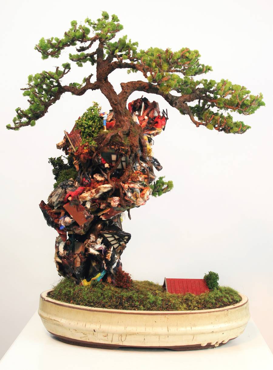 As enchanting as the intricate elements might seem, they often come together in a post-apocalyptical manner. The burned down dwellings and encaged tree visuals contrast the seemingly innocent medium, with a distinct binary between humanity and nature. Viewers are guided back a sense of youthful innocence—through memories of grade school plasticine exploration—only to then have that optimism quashed by less pliable concerns like resource depletion and the ravages of war. See more on the artist’s website.