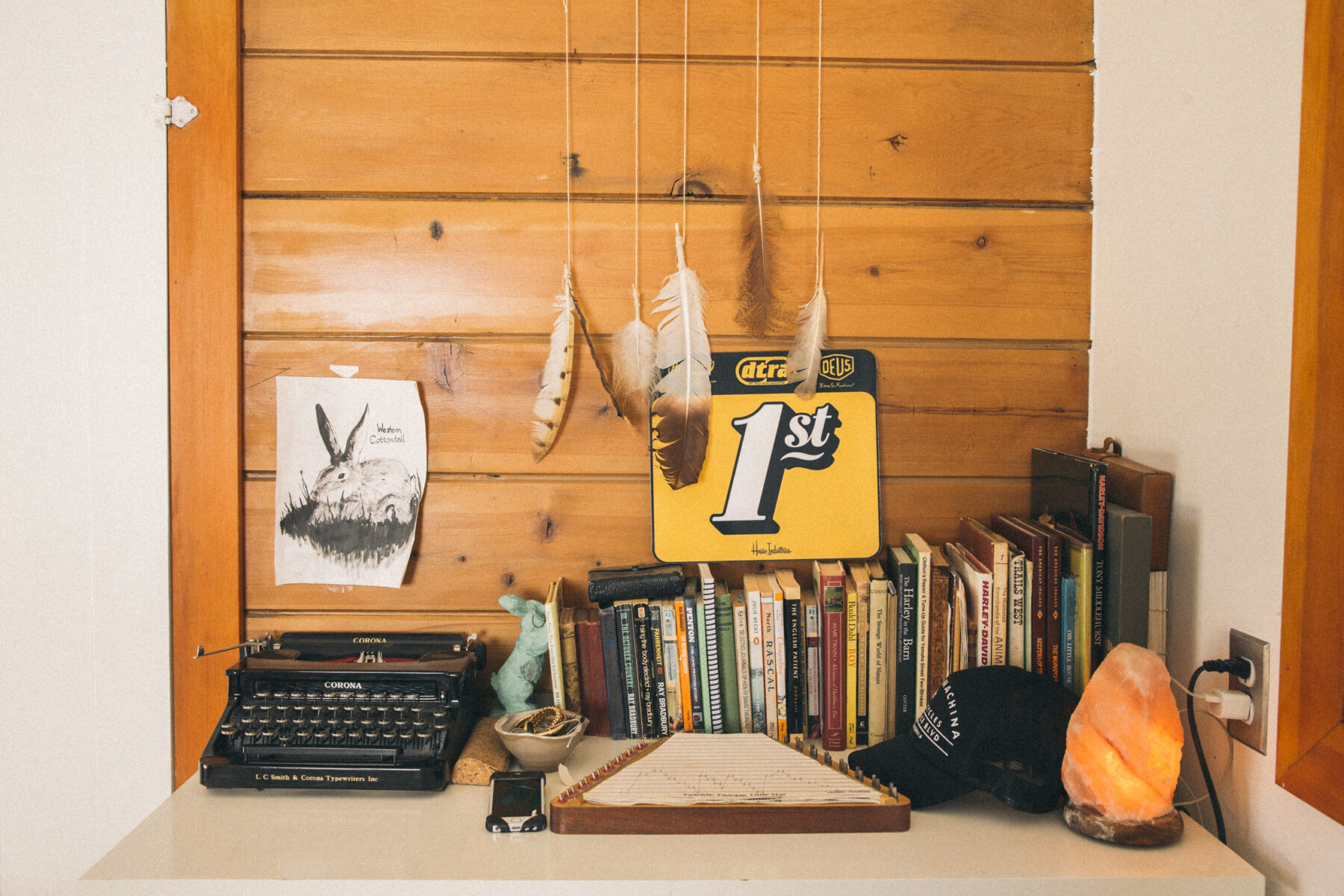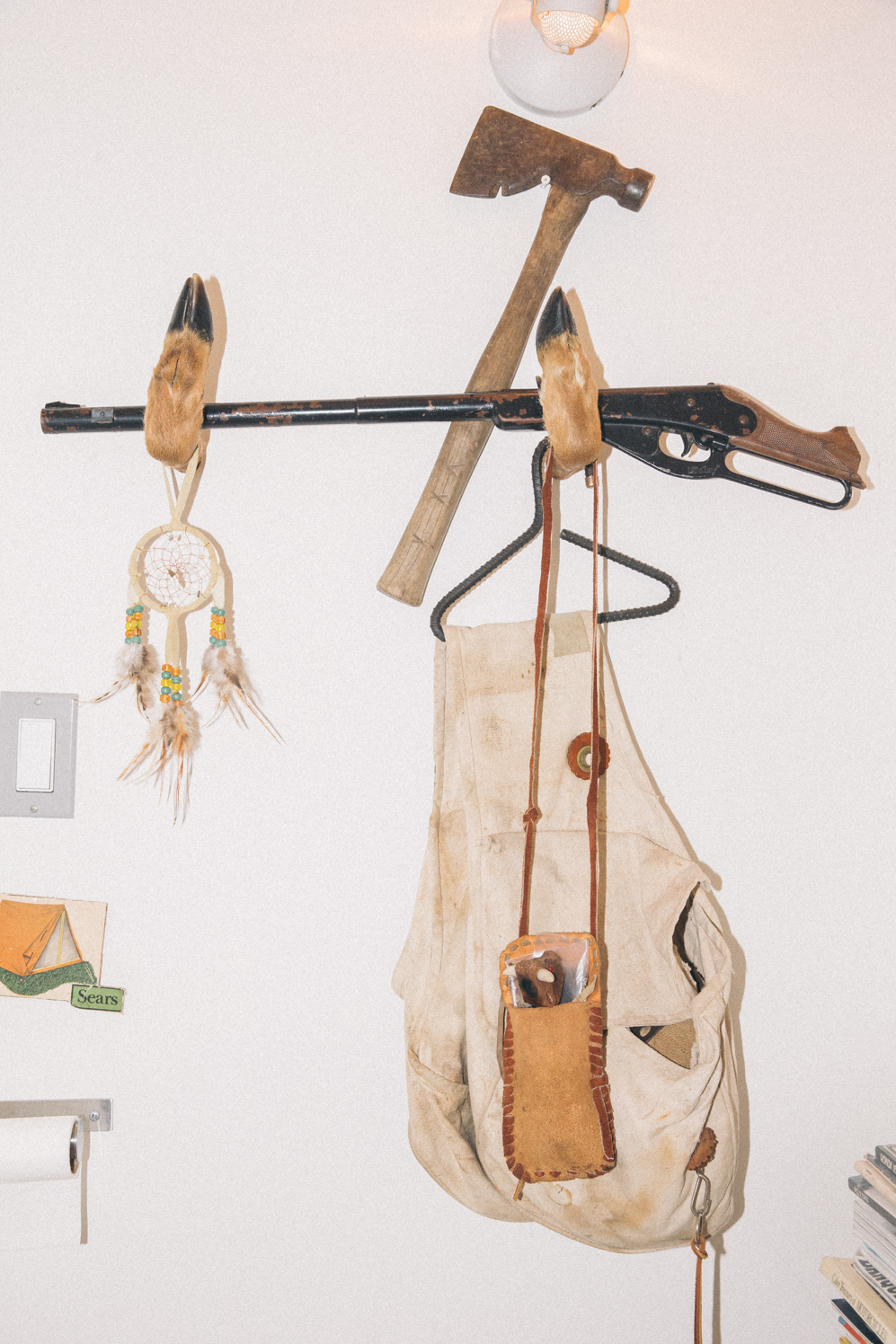 Scarlett now stays at home with Clementine — a creative endeavor all of its own. She’s the one who maintains the couple’s space, organizing the home and its art into just the right puzzle. Her creative bug is obviously still active, but she feels that a return to the LA art scene would be just too stressful. As Scarlett speaks, Nevin grins through his strawberry-blonde mustache, his hands in the pockets of his shearling jean jacket. He’s a member of the creative department for the motorcycle, clothing, and coffee brand Deus ex Machina. He commutes each day on a hefty black motorcycle, twisting through canyons or racing along the Pacific Coast Highway to his workplace in Venice Beach.