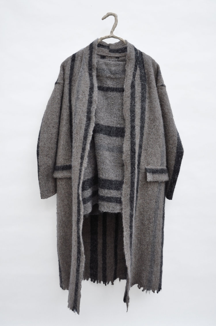 Amy’s hand-woven coats, sweaters and jackets made using Japanese yarns in muted colors