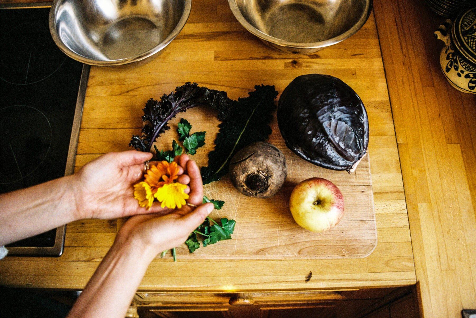 Joy washes two types of kale – cavolo nero and purple curly kale – and red cabbage quickly de-stemming them with practised ease. She then massages the leaves using a mixture of olive oil and salt which helps to break down the cell walls in the leaves making them more digestible. She then grates beetroot and layers it on top of the torn kale and the red cabbage leaves, tossing in some walnuts. Apples and parsley are added and then the secret salad dressing (a mixture of tahini, lemon, mustard, olive oil and honey) is drizzled on top. Finally she sprinkles on the golden Calendula petal and the salad is complete.