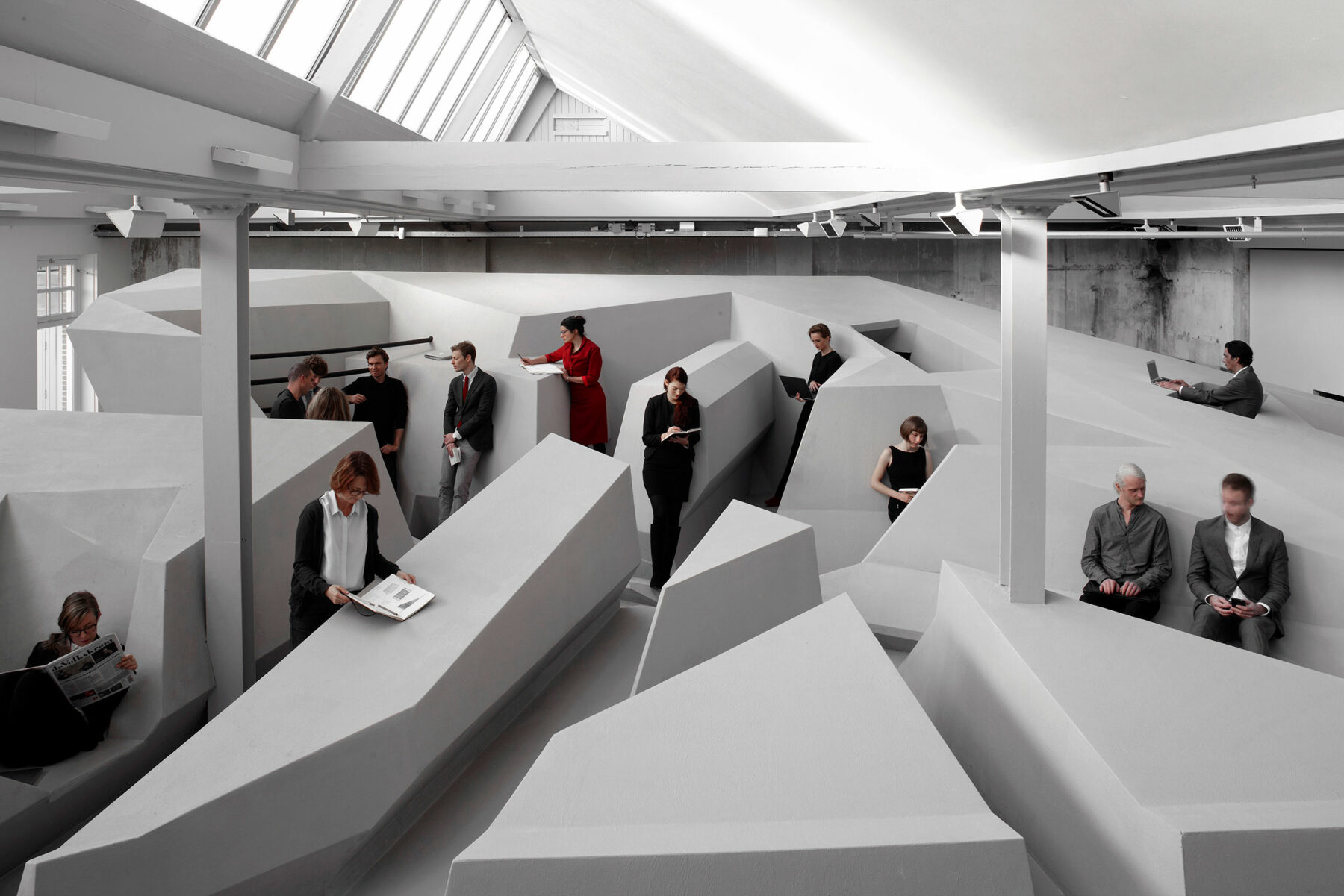 In fact, certain essential behavioral patterns are already steering towards immutability. With the “End of Sitting” project, RAAAF embarked on yet another visionary journey by offering a realistic scenario of how humans could interact with the workplace of the near future. A celestial scenery where white zig-zag plinths interlock in all kinds of angles—except for the common rectangle of course. Chairs are banned. Instead, visitors are invited to actively experiment with their body positions. The project was again inspired by what the team found in history: diverse working positions during the Renaissance or the fact that Virginia Woolf and Winston Churchill used to work standing. But even more thought-provoking is RAAAF’s attempt to “raise awareness of health issues caused by prolonged sitting and present the benefits of a highly alerted mind,” as Arna puts it. Their work seems to be a much-needed hand in saving society from plunging into paralysis.